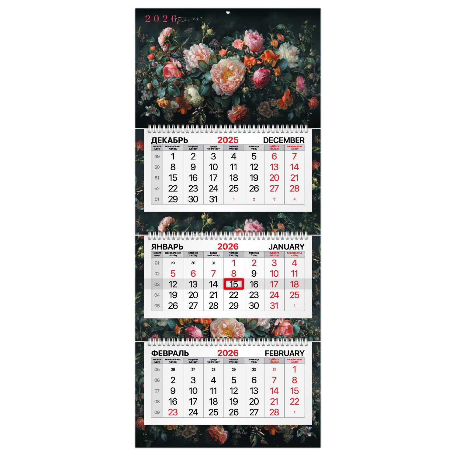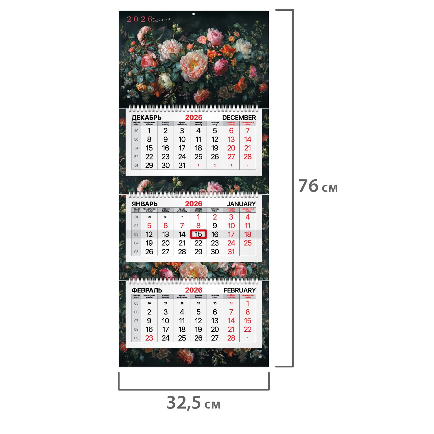Календарь квартальный 2026г, 3 блока 3 гребня бегунок, мелованная бумага, BRAUBERG EXTRA, Цветы, 116826