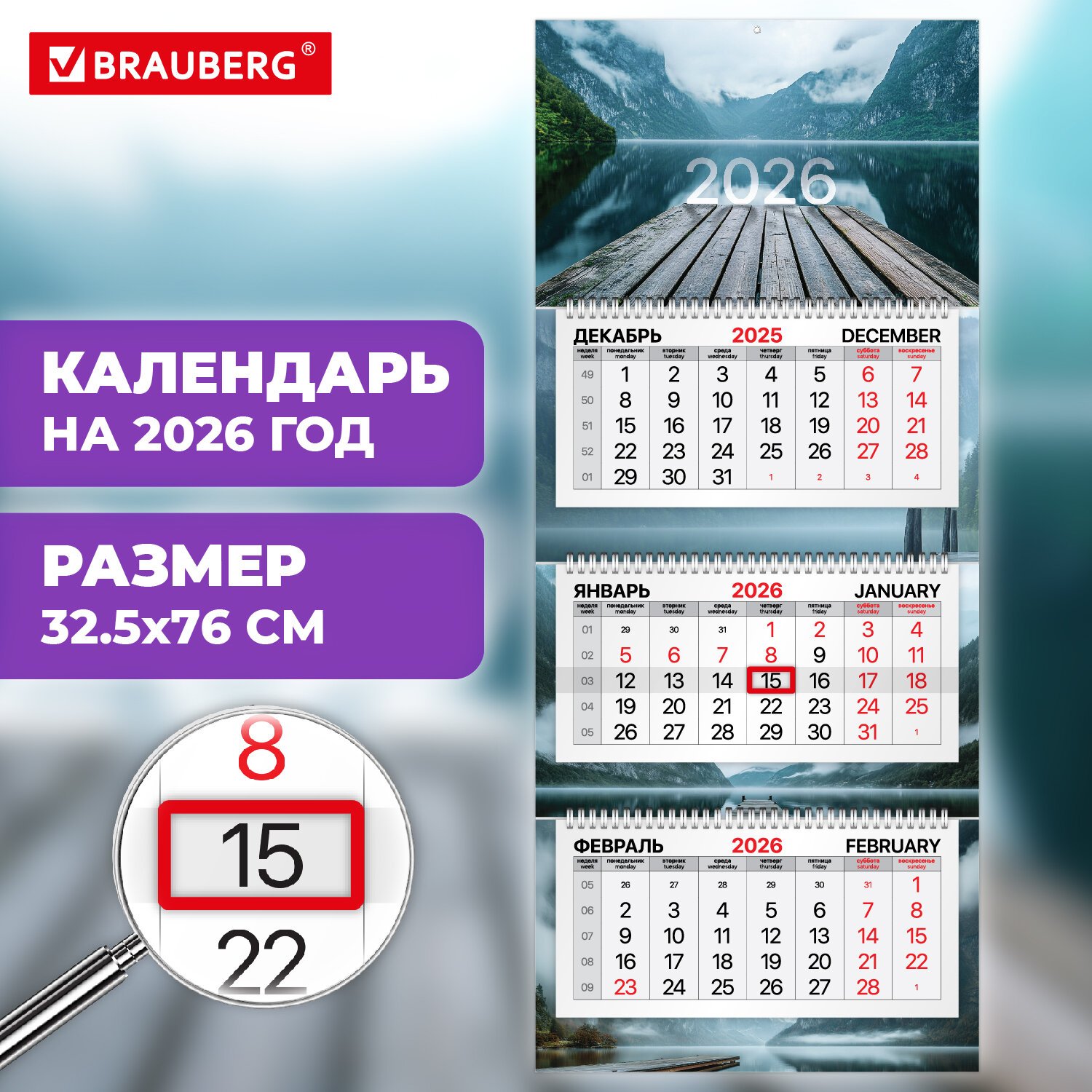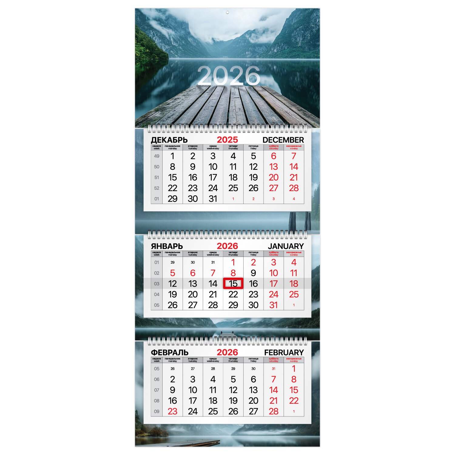 Календарь квартальный 2026г, 3 блока 3 гребня, бегунок, мелованная бумага, BRAUBERG Premium, Озеро, 116829