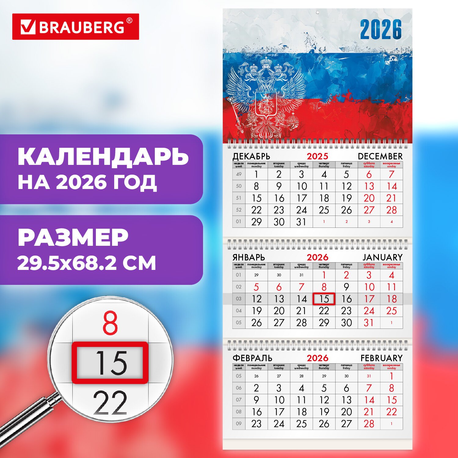 Календарь квартальный 2026г, 3 блока 3 гребня бегунок, мелованная бумага, BRAUBERG, Символы России, 116795