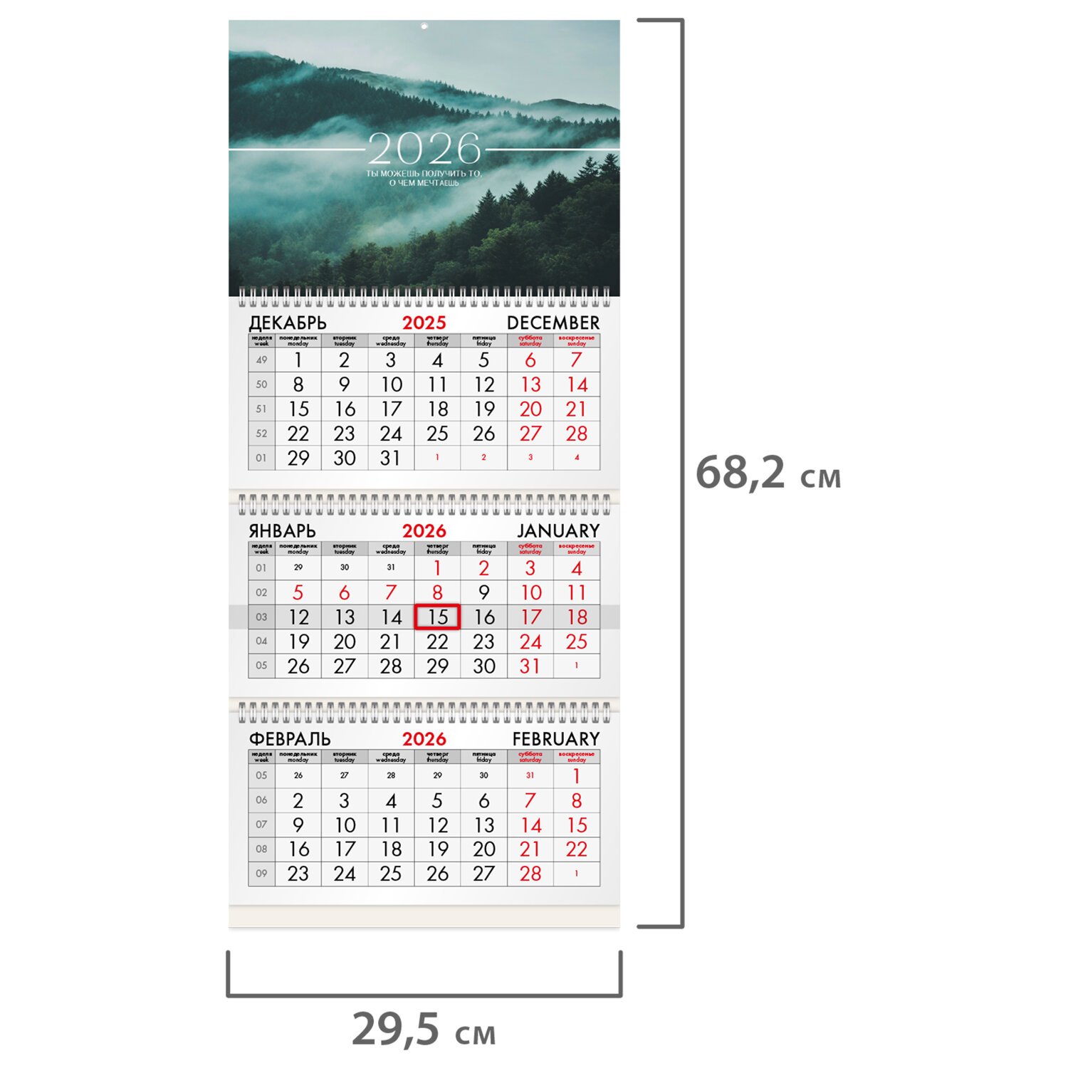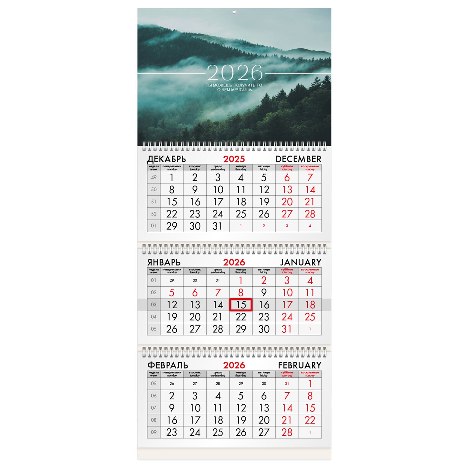 Календарь квартальный 2026г, 3 блока 3 гребня бегунок, мелованная бумага, BRAUBERG, Туманный лес, 116808