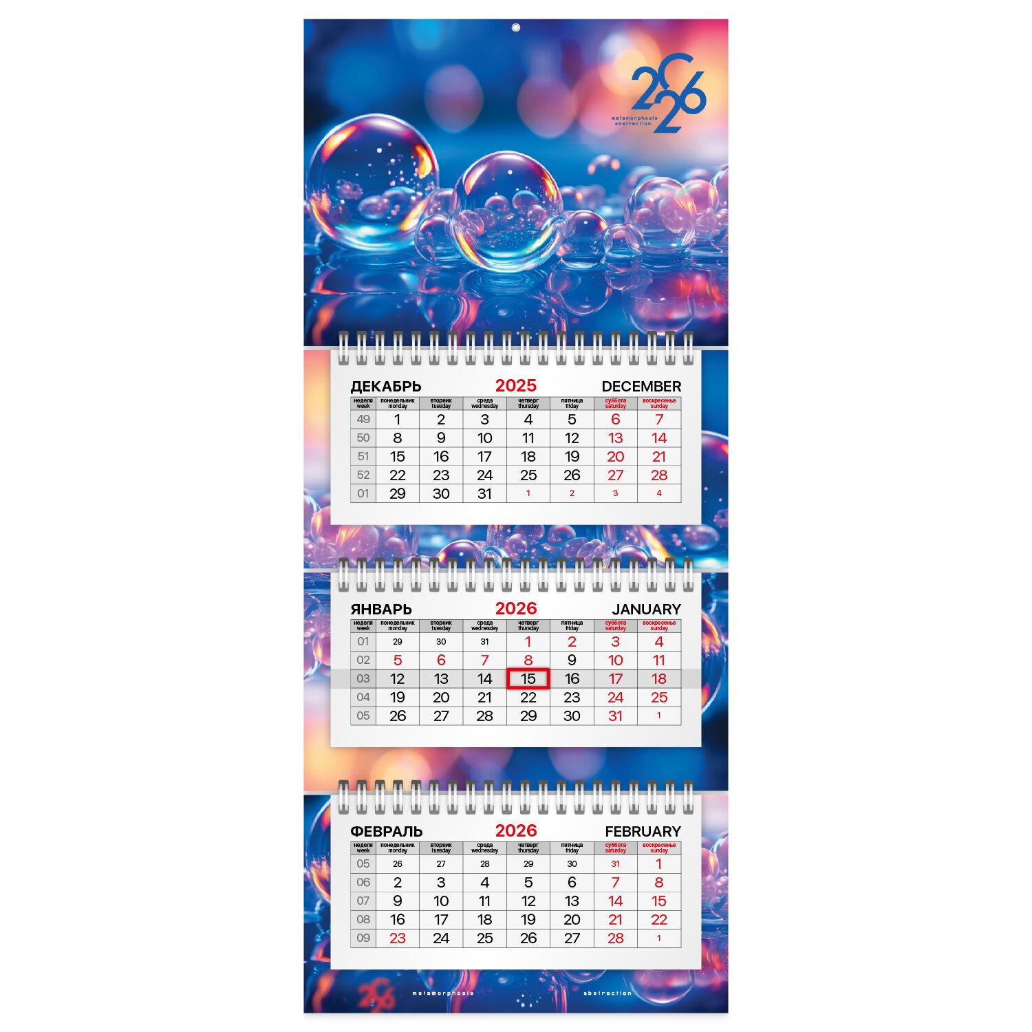 Офисный календарь на 2026 год на 3 гребнях. Для удобства планирования состоит из 3 блоков с календарными сетками на три месяца – предыдущий, текущий и следующий. Курсор-бегунок выделяет текущую дату.