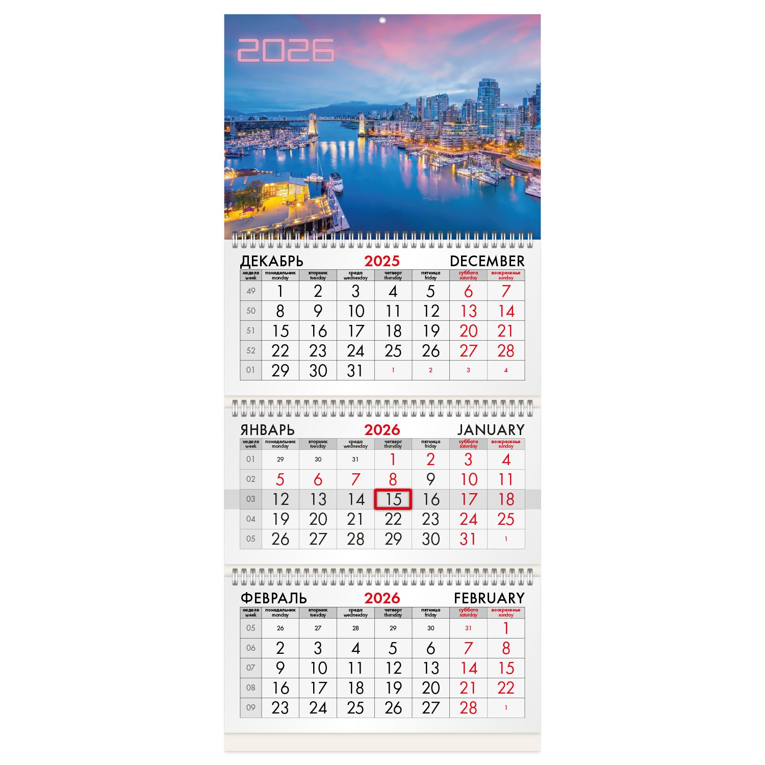 Офисный календарь на 2026 год на 3-х гребнях. Для удобства планирования состоит из 3-х блоков с календарными сетками на три месяца - предыдущего, текущего и последующего. Блок календаря напечатан на офсетной бумаге плотностью 65 г/м2. Подложка изготовлена из мелованного картона плотностью 235 г/м2. Курсор-бегунок выделяет текущую дату. Вертикальное расположение.