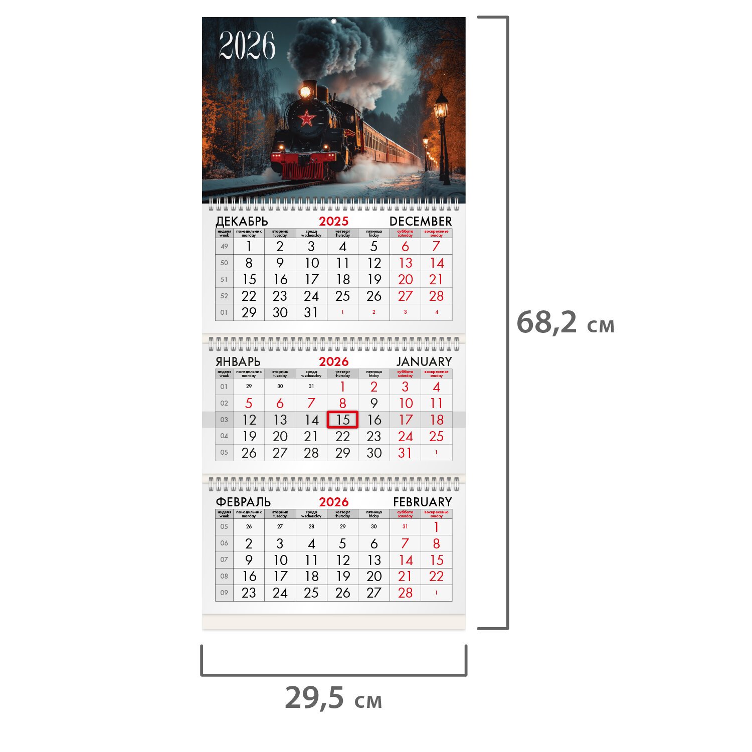 Офисный календарь на 2026 год на 3-х гребнях. Для удобства планирования состоит из 3-х блоков с календарными сетками на три месяца - предыдущего, текущего и последующего. Блок календаря напечатан на офсетной бумаге плотностью 65 г/м2. Подложка изготовлена из мелованного картона плотностью 235 г/м2. Курсор-бегунок выделяет текущую дату. Вертикальное расположение.