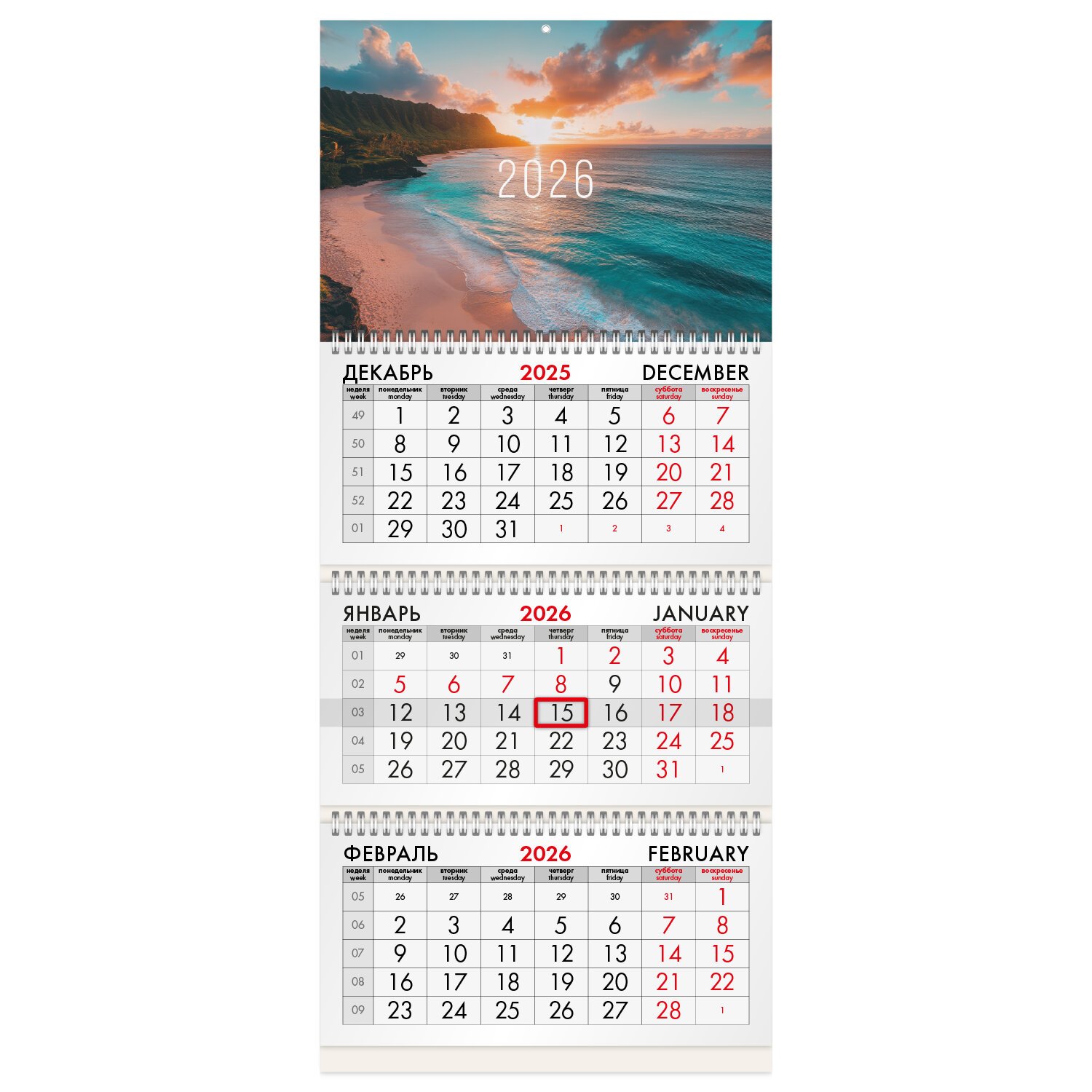 Офисный календарь на 2026 год на 3-х гребнях. Для удобства планирования состоит из 3-х блоков с календарными сетками на три месяца - предыдущего, текущего и последующего. Блок календаря напечатан на офсетной бумаге плотностью 65 г/м2. Подложка изготовлена из мелованного картона плотностью 235 г/м2. Курсор-бегунок выделяет текущую дату. Вертикальное расположение.