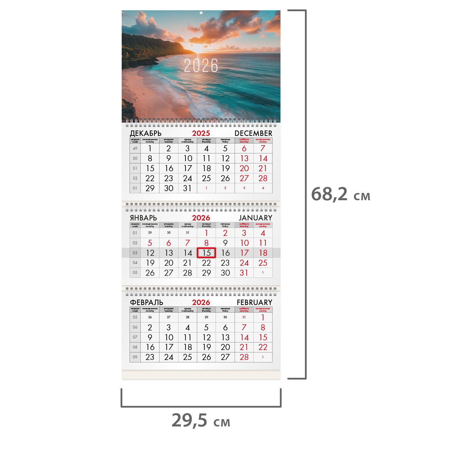 Календарь квартальный 2026г, 3 блока 3 гребня бегунок, офсет, BRAUBERG, Побережье, 116772