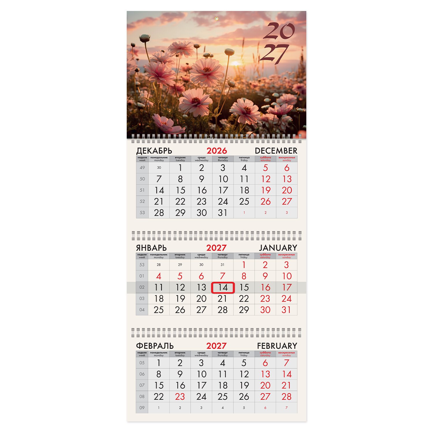 Офисный календарь на 2027 год на 3 гребнях. Состоит из 3 блоков с календарными сетками на три месяца – предыдущий, текущий и последующий. Блок календаря напечатан на офсетной бумаге плотностью 65 г/м2. Подложка изготовлена из мелованного картона плотностью 250 г/м2. Курсор-бегунок выделяет текущую дату. Вертикальный формат.