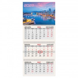 Офисный календарь на 2027 год на 3 гребнях. Состоит из 3 блоков с календарными сетками на три месяца – предыдущий, текущий и последующий. Блок календаря напечатан на офсетной бумаге плотностью 65 г/м2. Подложка изготовлена из мелованного картона плотностью 250 г/м2. Курсор-бегунок выделяет текущую дату. Вертикальный формат.