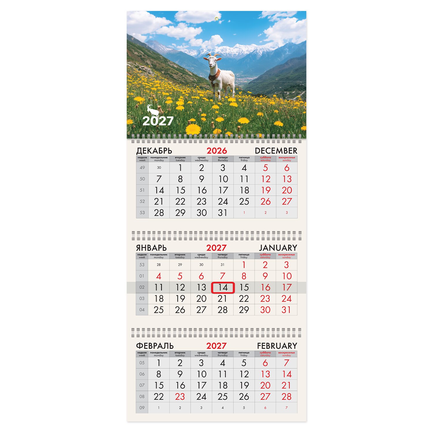 Календарь квартальный 2027г, 3 блока 3 гребня, бегунок, офсет, BRAUBERG, "Козочка на лугу", 118251