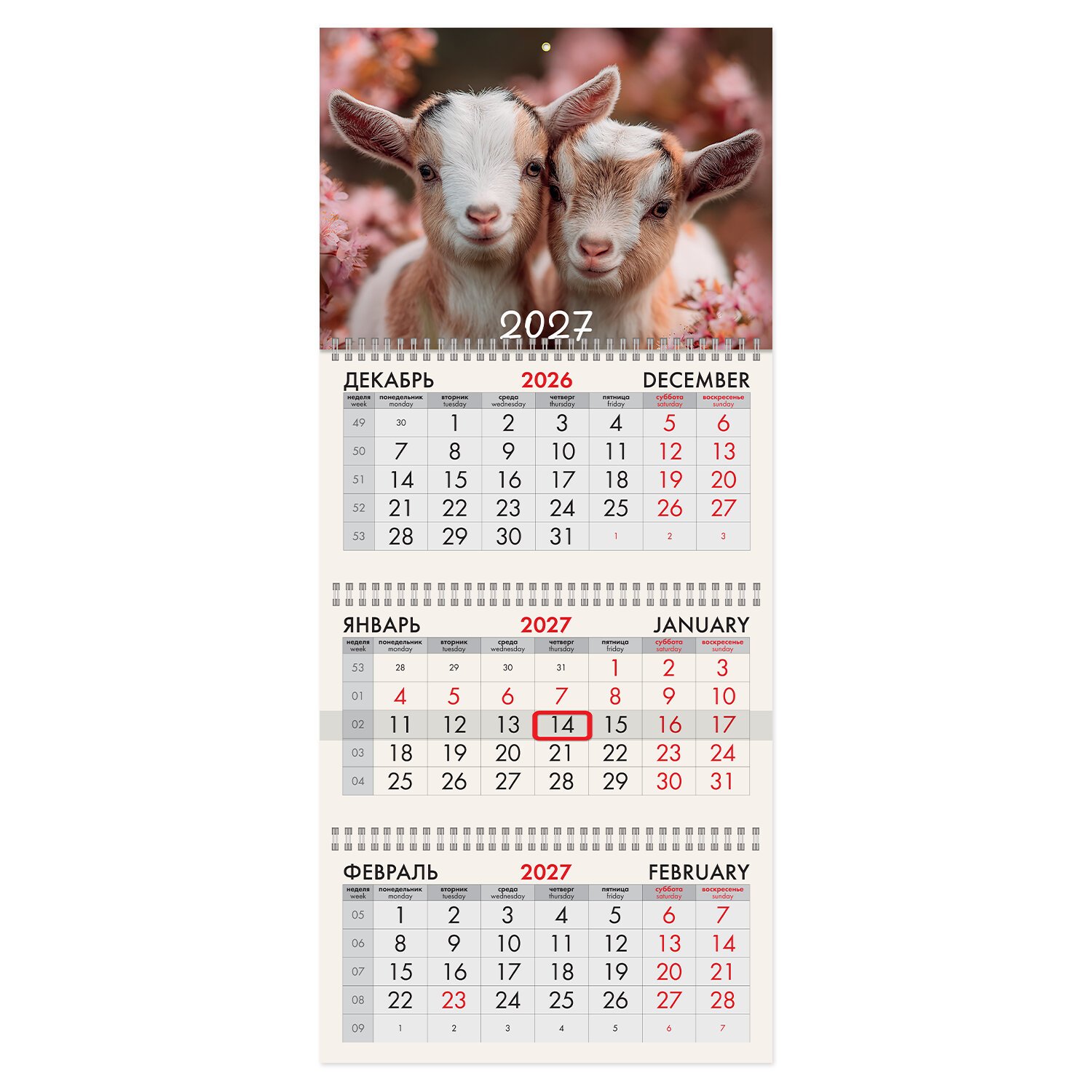 Календарь квартальный 2027г, 3 блока 3 гребня, бегунок, офсет, BRAUBERG, "Козочки", 118248