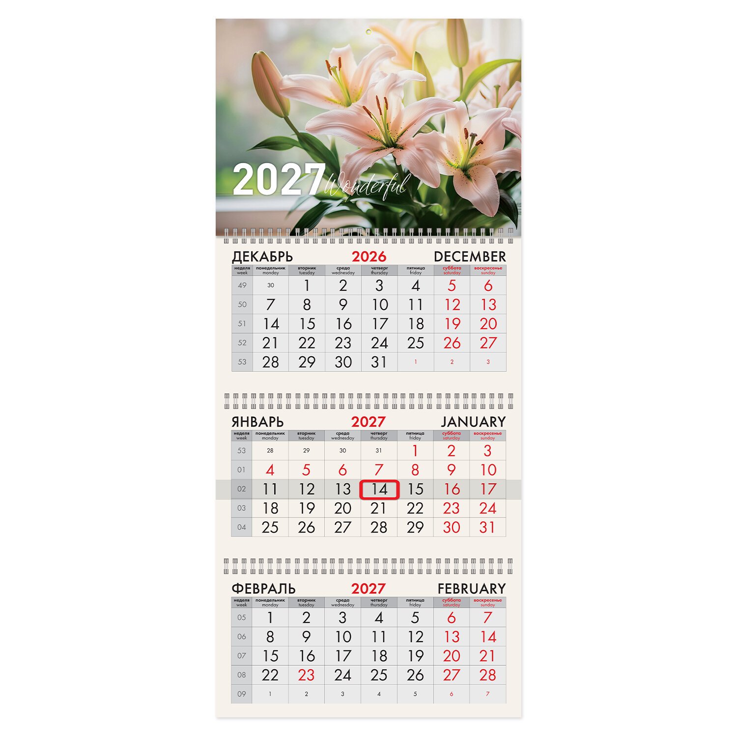 Офисный календарь на 2027 год на 3 гребнях. Состоит из 3 блоков с календарными сетками на три месяца – предыдущий, текущий и последующий. Блок календаря напечатан на офсетной бумаге плотностью 65 г/м2. Подложка изготовлена из мелованного картона плотностью 250 г/м2. Курсор-бегунок выделяет текущую дату. Вертикальный формат.
