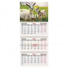 Офисный календарь на 2027 год на 3 гребнях. Состоит из 3 блоков с календарными сетками на три месяца – предыдущий, текущий и последующий. Блок календаря напечатан на офсетной бумаге плотностью 65 г/м2. Подложка изготовлена из мелованного картона плотностью 250 г/м2. Курсор-бегунок выделяет текущую дату. Вертикальный формат.
