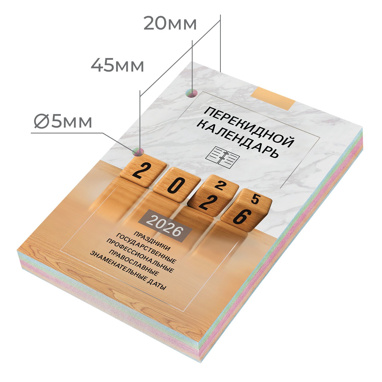 Блок календаря на 2026 год напечатан на офсетной бумаге плотностью 60 г/м2 в четыре краски с выделением цветом выходных и праздничных дней. Справочная информация на 160 листах: календарь на текущий месяц, часы восхода и захода солнца, долгота дня, лунный календарь, праздники.