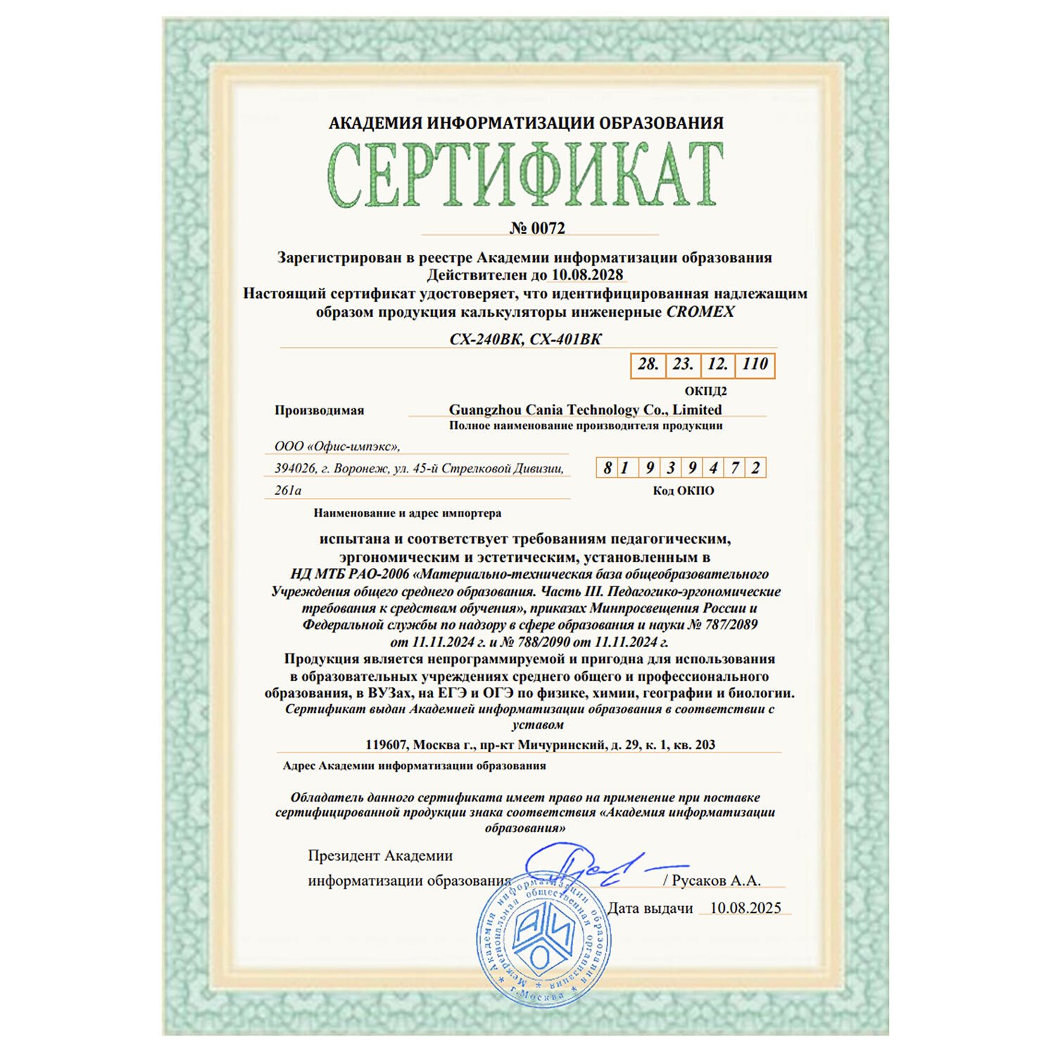 | Сертифицирован для ЕГЭ | да |