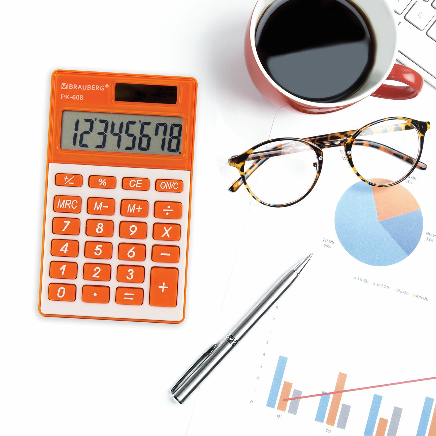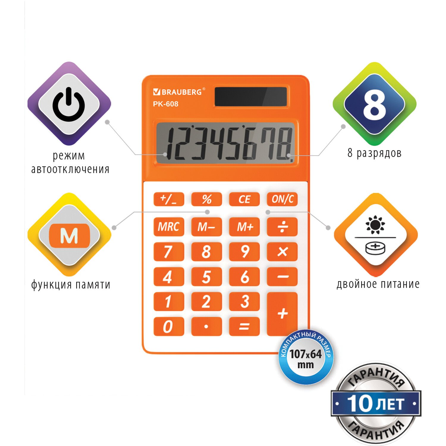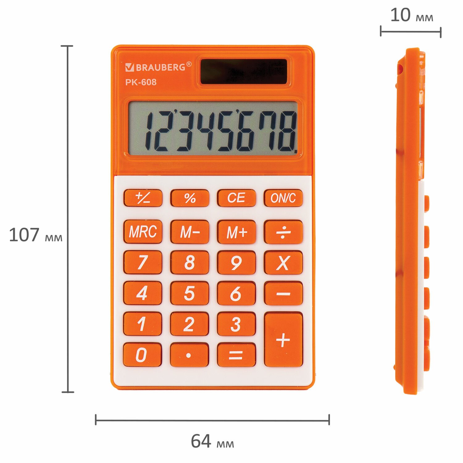 Калькулятор карманный BRAUBERG PK-608-RG (107x64 мм), 8 разрядов, двойное питание, ОРАНЖЕВЫЙ, 250522