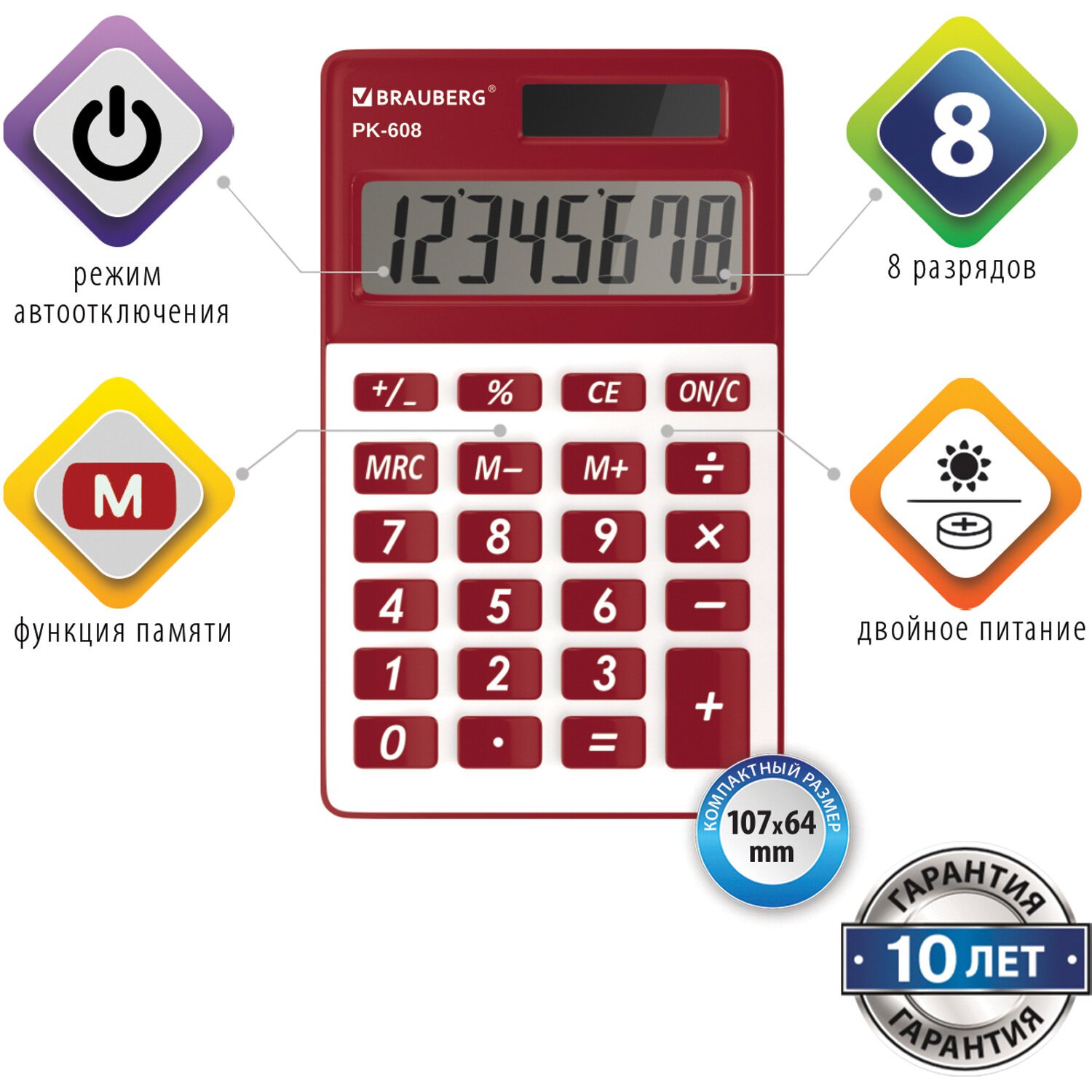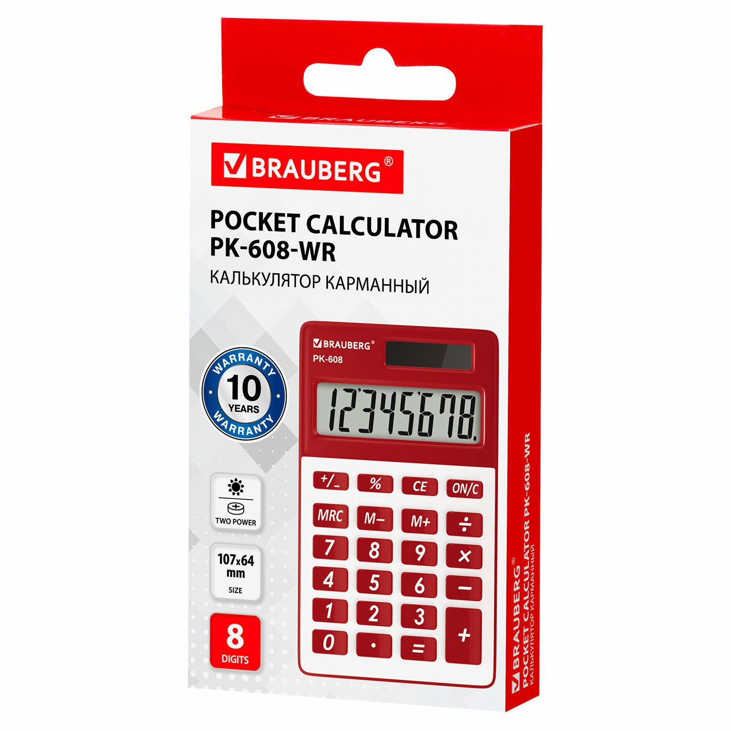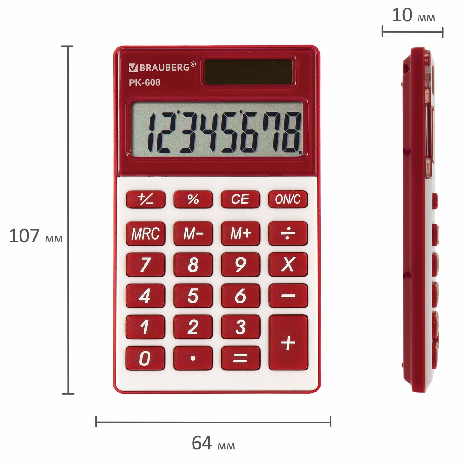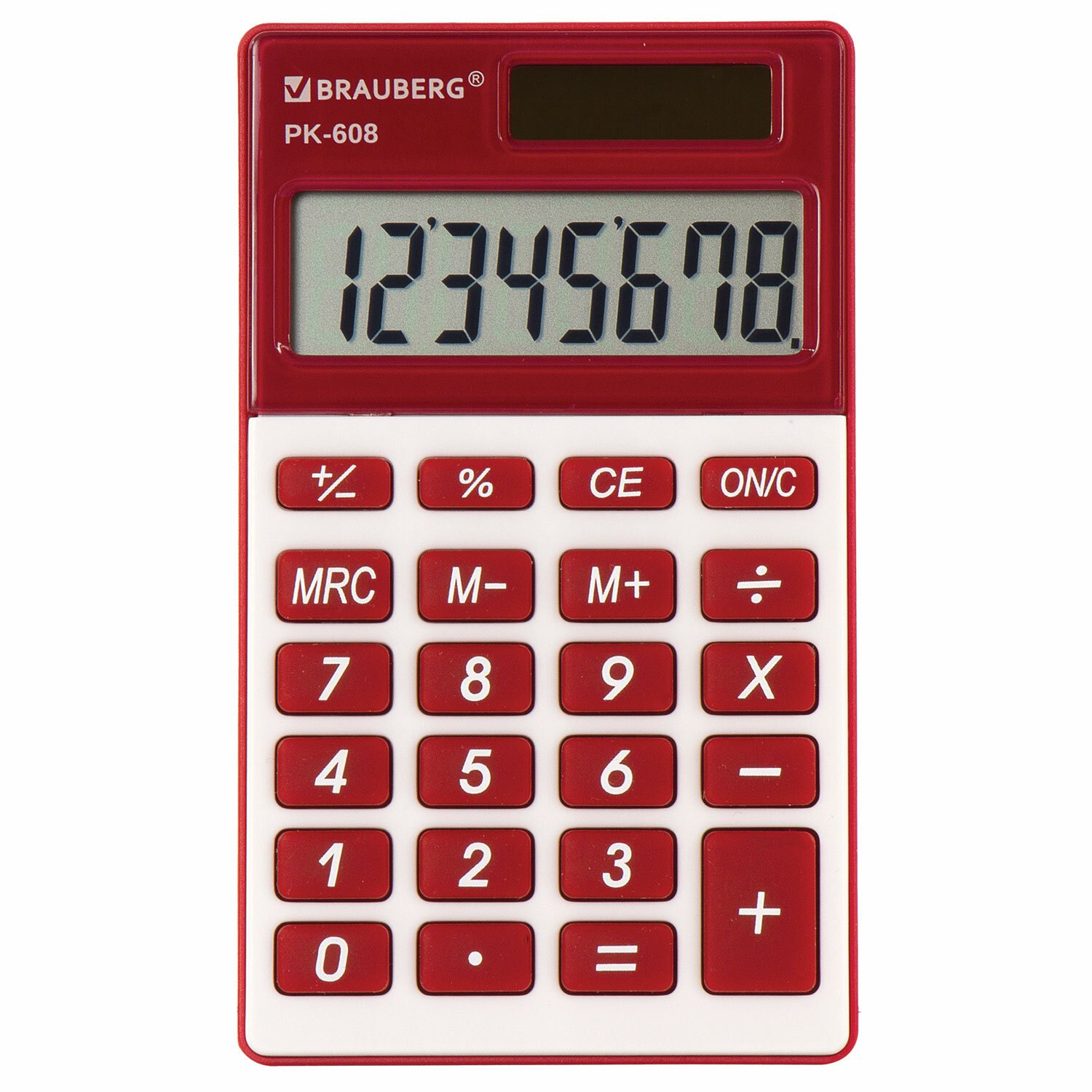 Калькулятор карманный BRAUBERG PK-608-WR (107x64 мм), 8 разрядов, двойное питание, БОРДОВЫЙ, 250521