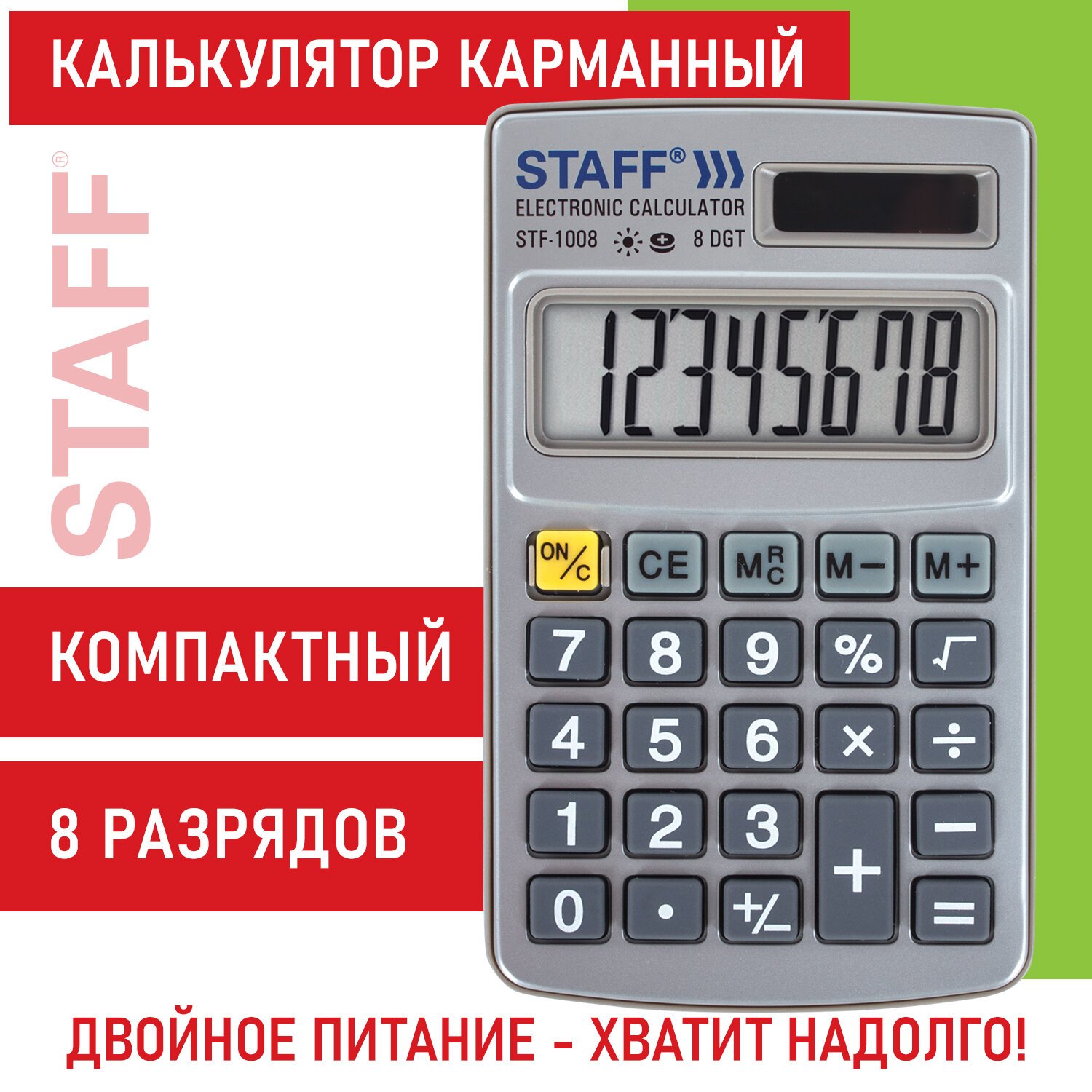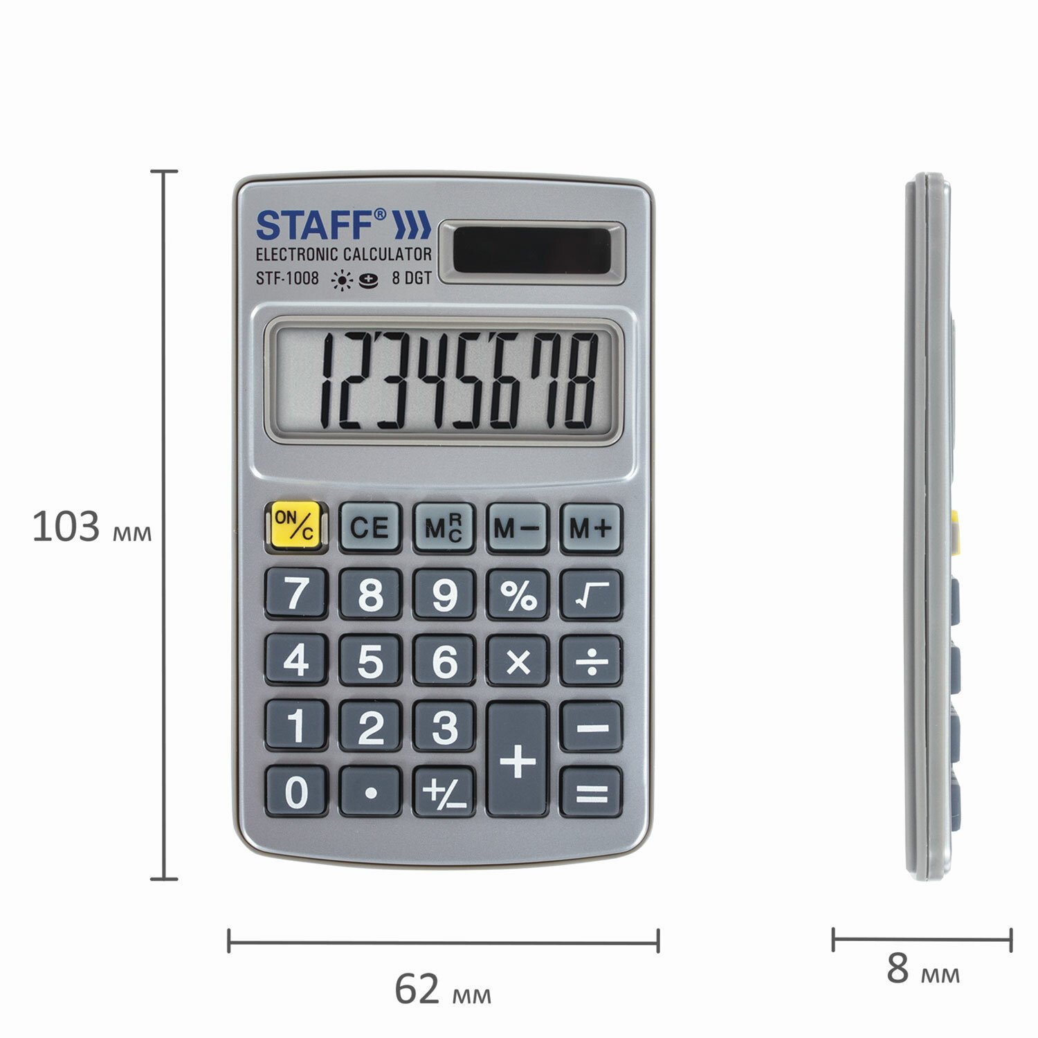 Прочный и надёжный карманный калькулятор STAFF STF-1008 поможет выполнить базовые вычисления везде, где Вам понадобится. Калькулятор легко помещается в карман и удобно лежит в руке.