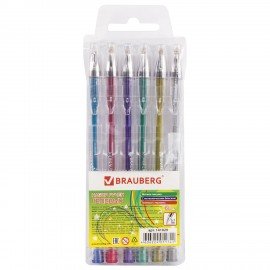 Ручки гелевые BRAUBERG "Jet", НАБОР 6 ЦВЕТОВ, МЕТАЛЛИК, узел 0,7 мм, линия письма 0,5 мм, 141029