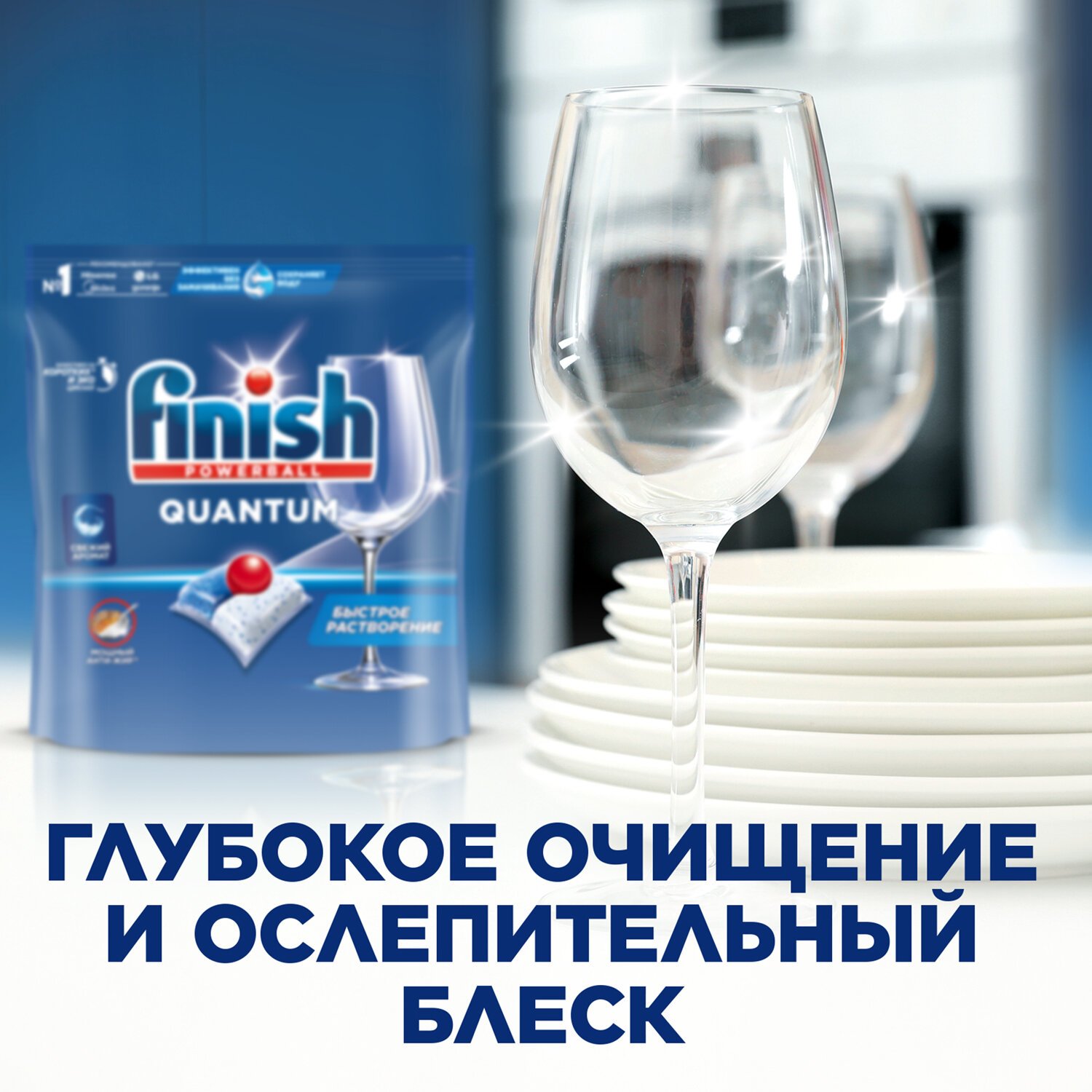 Капсулы для посудомоечных машин Finish Quantum для глубокого очищения и ослепительного блеска вашей посуды. Не содержат фосфаты.