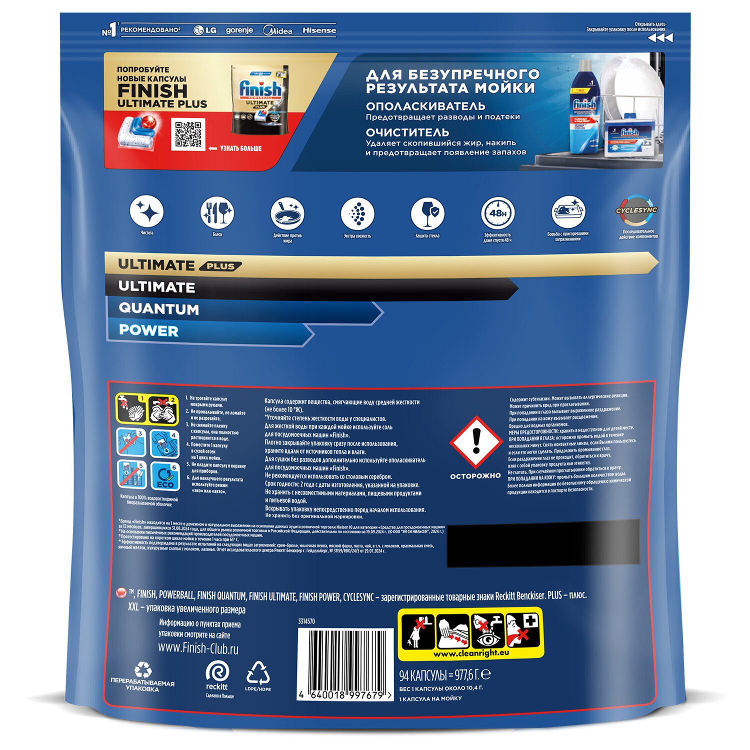 Для достижения максимального результата и при очень жесткой воде рекомендуем попробовать специальную соль и ополаскиватель Finish.