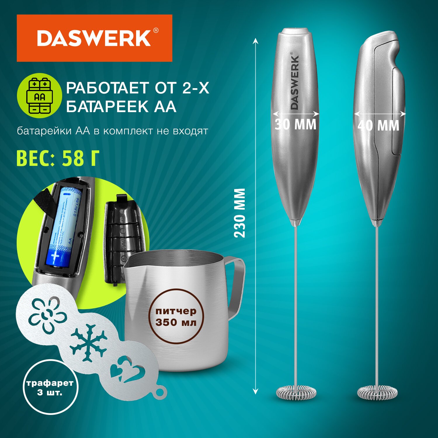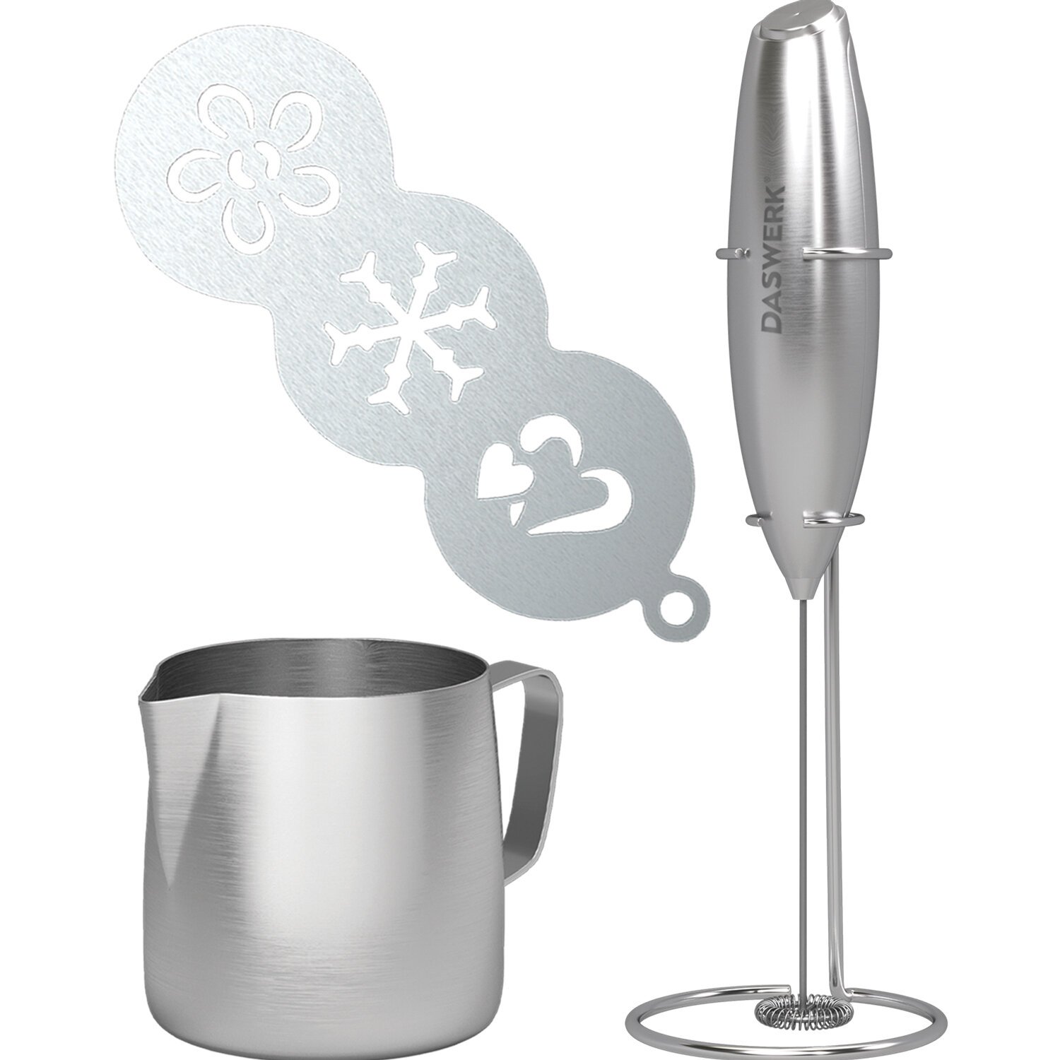 Капучинатор/вспениватель электрический с подставкой, питчером, трафаретами 4 в 1, серебряный, DASWERK, 456182