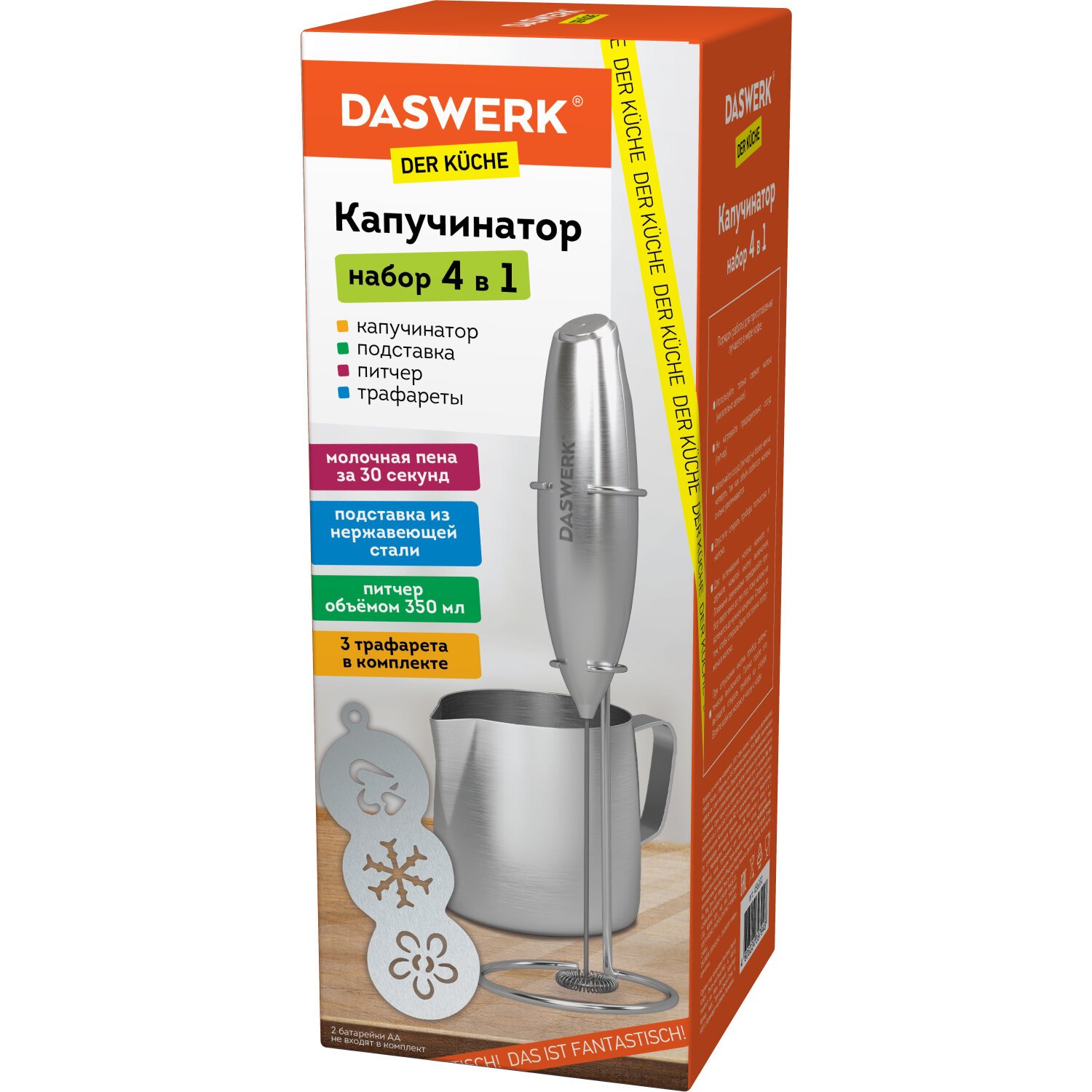 Набор бариста DASWERK 4 в 1 включает в себя всё самое необходимое для приготовления лучшего кофе в мире. Капучинатор оснащен мощным мотором и создает плотную и бархатистую пену за считаные секунды. Он прост в использовании, интуитивно понятен и обеспечивает высококачественный результат.