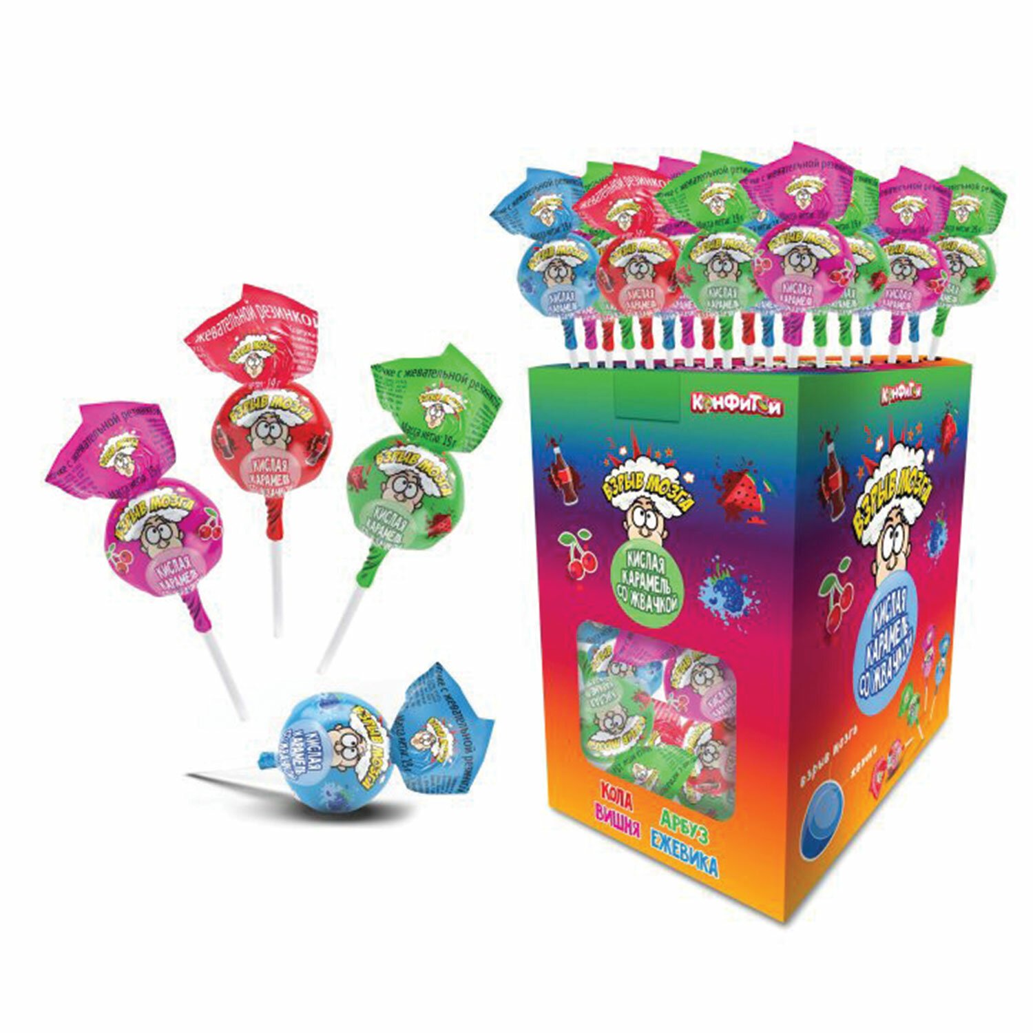 "ВЗРЫВ МОЗГА" - это необычная кисло-сладкая карамель на палочке с жевательной резинкой внутри. В блоке представлены целых четыре ярких вкуса: кола, вишня, арбуз и ежевика.