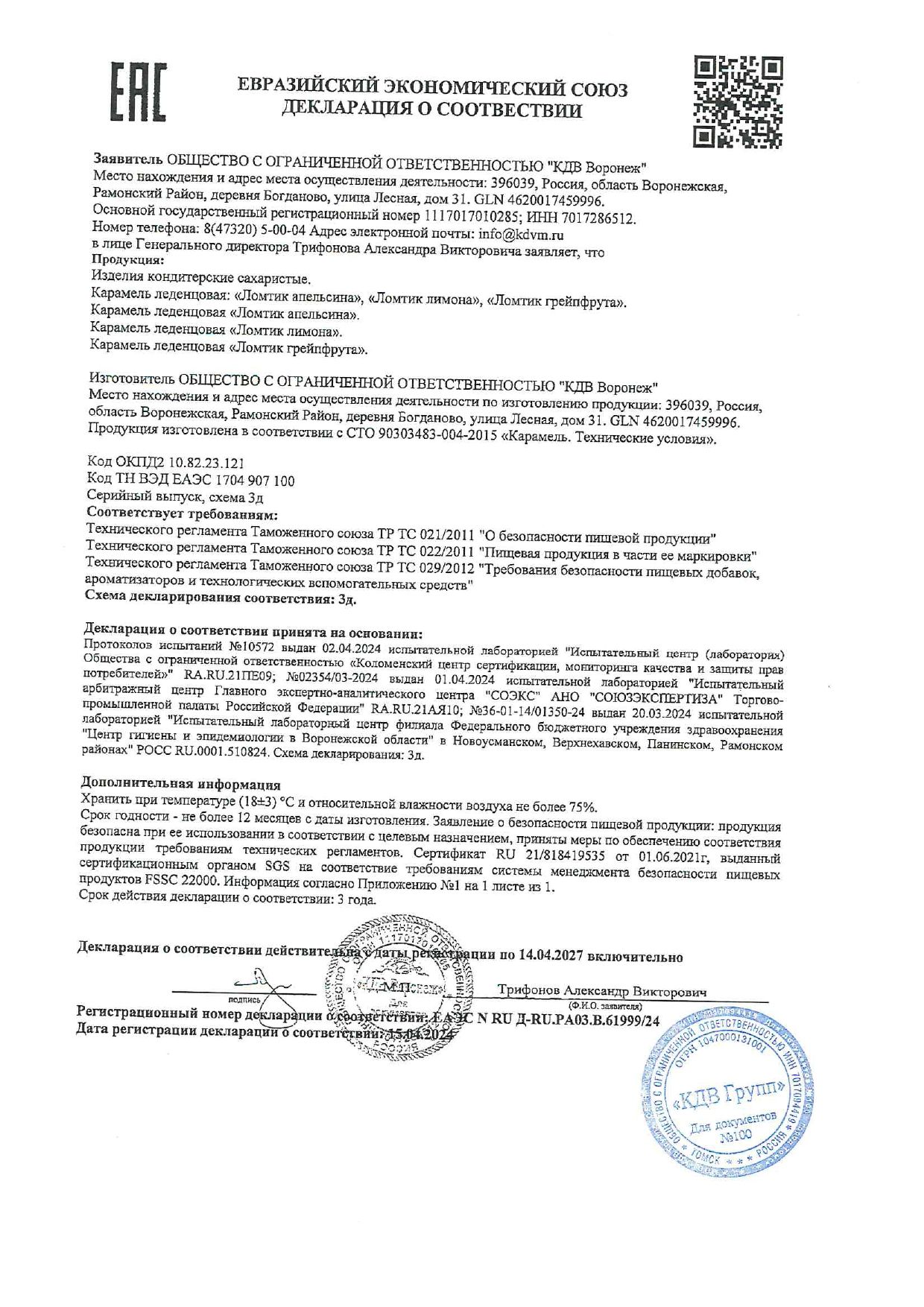 Карамель леденцовая ЛОМТИК ассорти (апельсин, лимон, грейпфрут), 500 г, ВК276