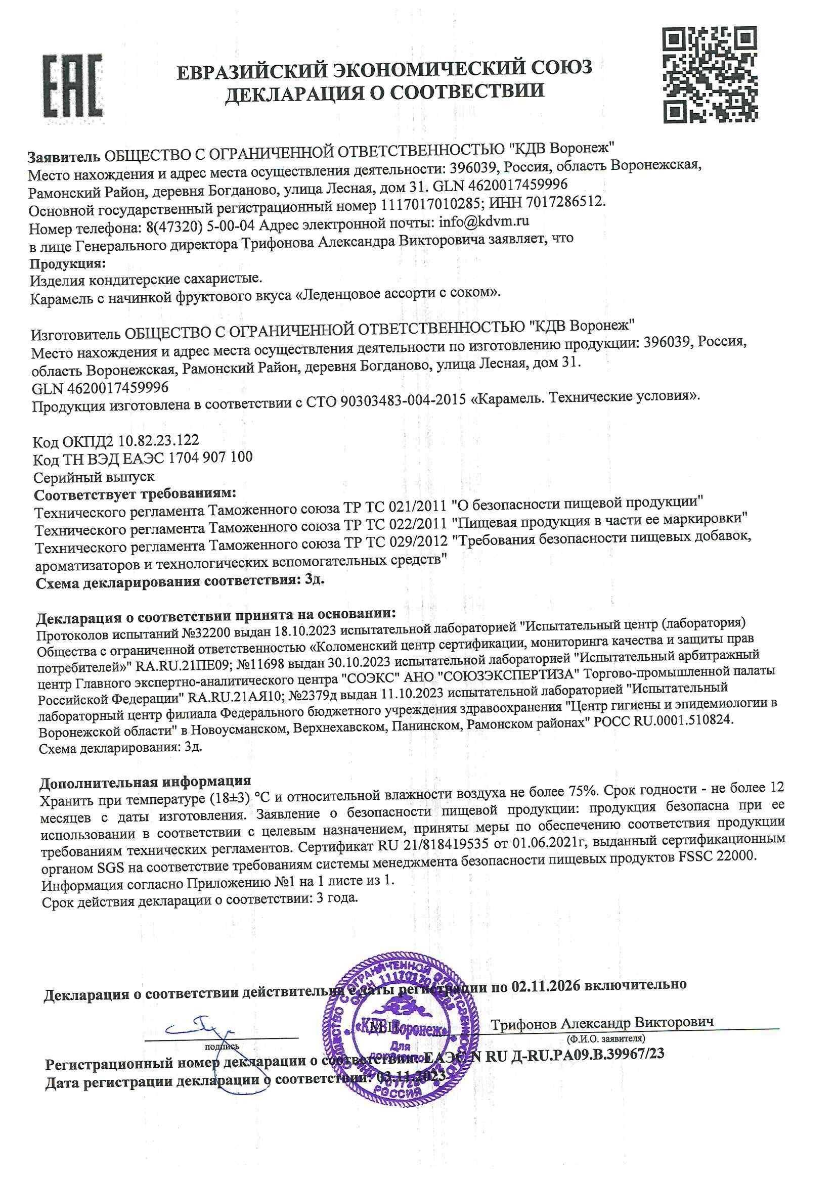 Патока, сахар, регулятор кислотности: лимонная кислота; стабилизатор: цитрат натрия; ароматизаторы, концентрированный сок фиолетовой моркови, красители: медные комплексы хлорофиллинов, куркумин. Может содержать следы глютена, яиц, молока, арахиса, сои, орехов и продуктов их переработки.