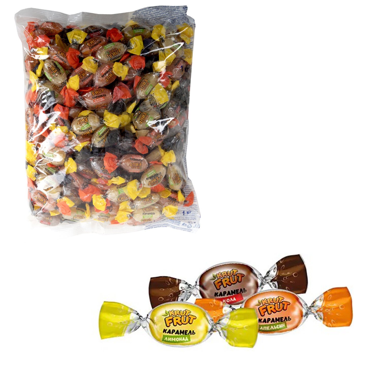 Карамель с шипучей начинкой KRUTFRUT со вкусом колы, апельсина, лимона, 1 кг, РВК758
