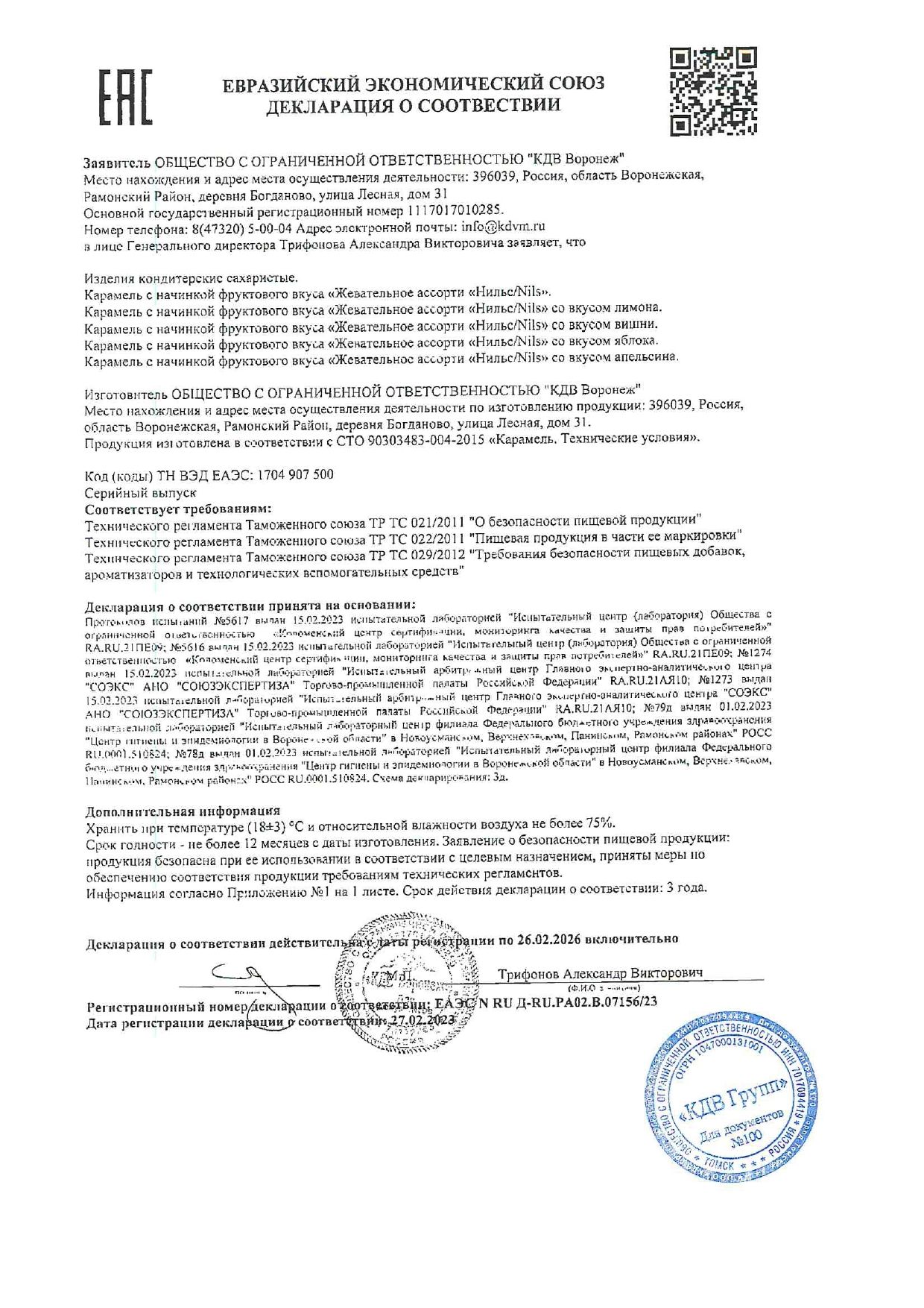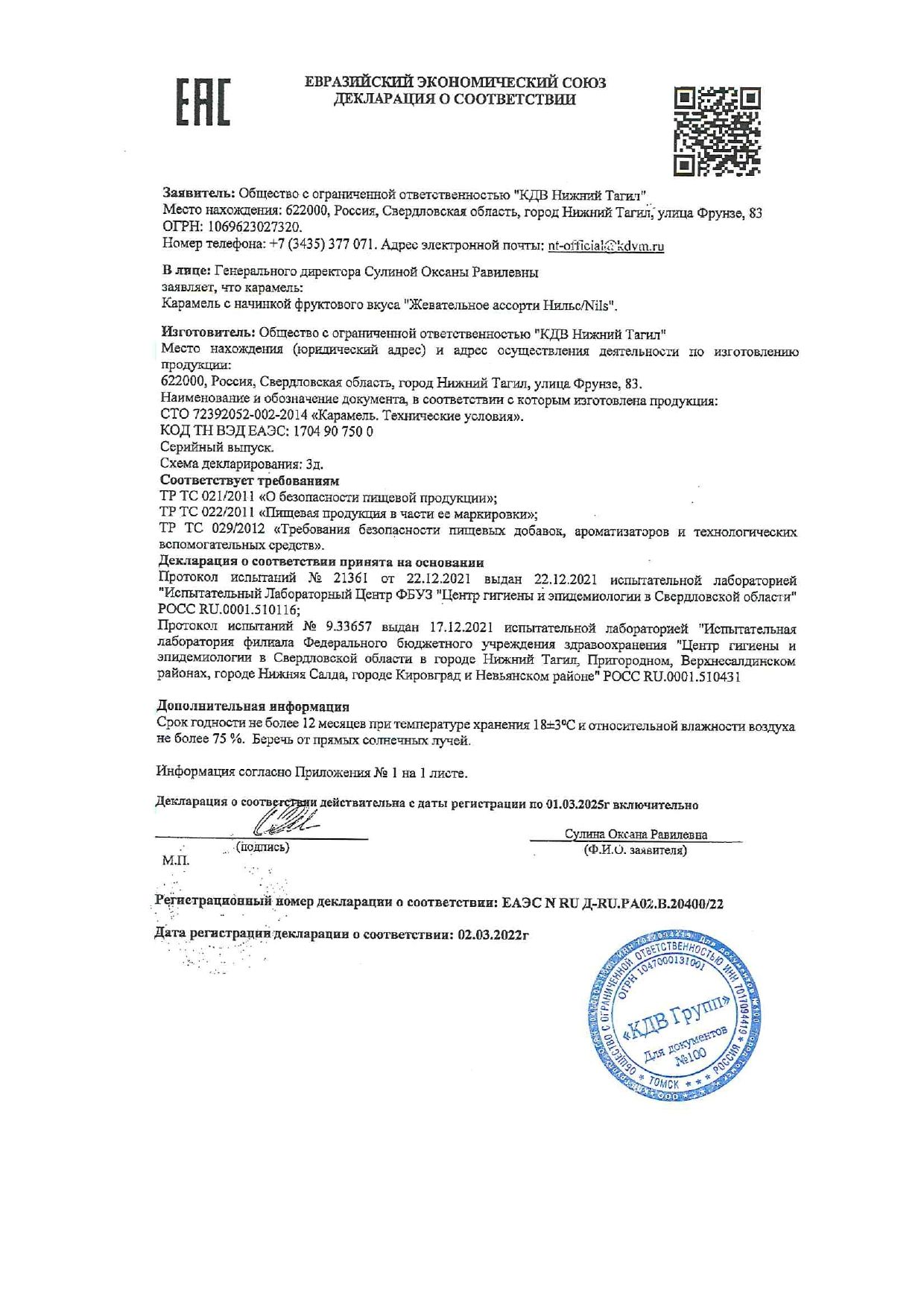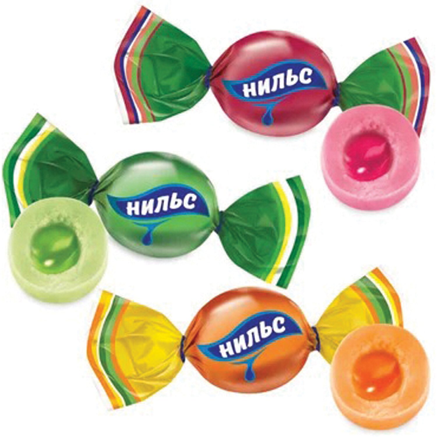 Ассорти из мягкой жевательной карамели со вкусами вишни, яблока и апельсина. Жевательная карамель «Нильс» – уникальный продукт, не имеющий аналогов в России. Особенность конфеты – щелчок, который ощущается при раскусывании.