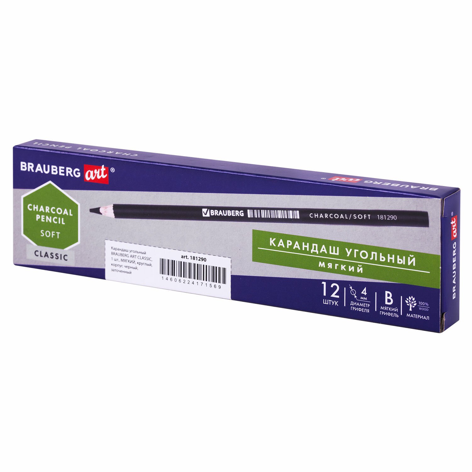 Карандаш (1 штука) угольный BRAUBERG ART CLASSIC, МЯГКИЙ, круглый, корпус черный, заточенный, 181290