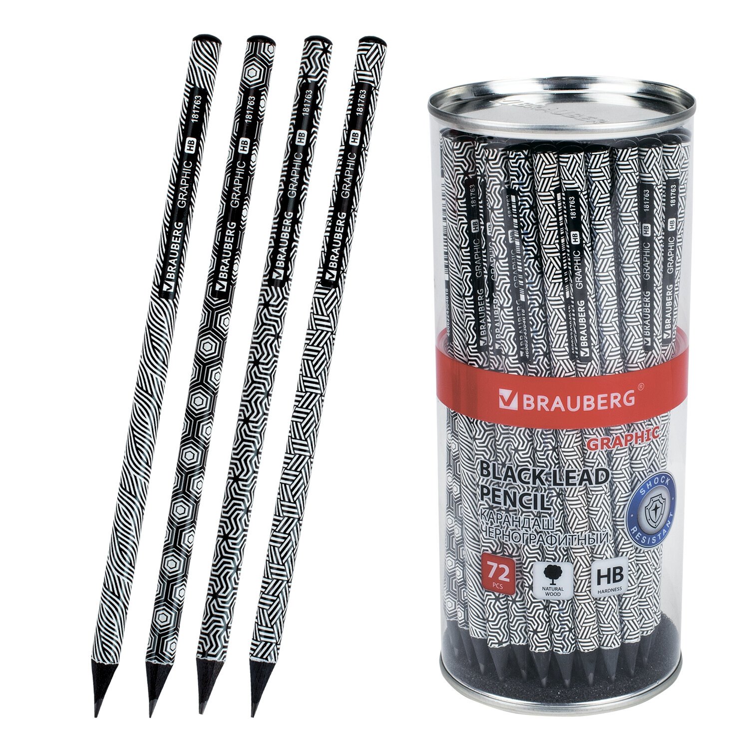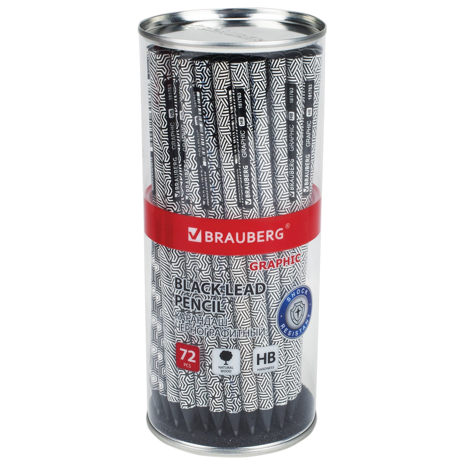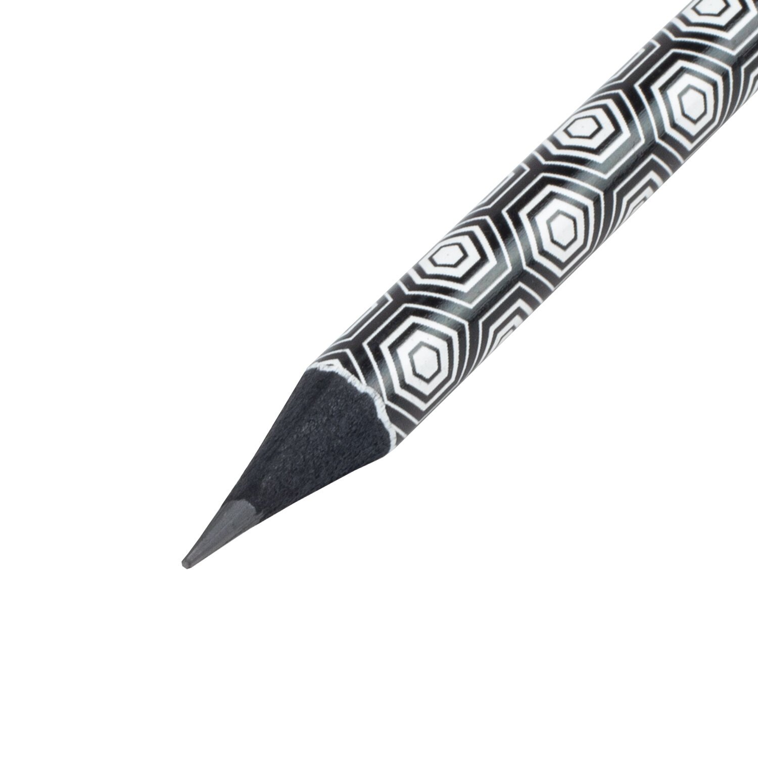 Каждый карандаш имеет индивидуальный штрих-код. Легко затачивается, максимально устойчив к повреждениям. Изготовлен из черного дерева высокого качества. Имеет круглое сечение. Карандаш длиной 172 мм обладает средней степенью твердости – HB. Корпус покрыт цветной печатью ассорти в 4 дизайнах. Поставляется заточенным в пластиковой тубе по 72 штуки.