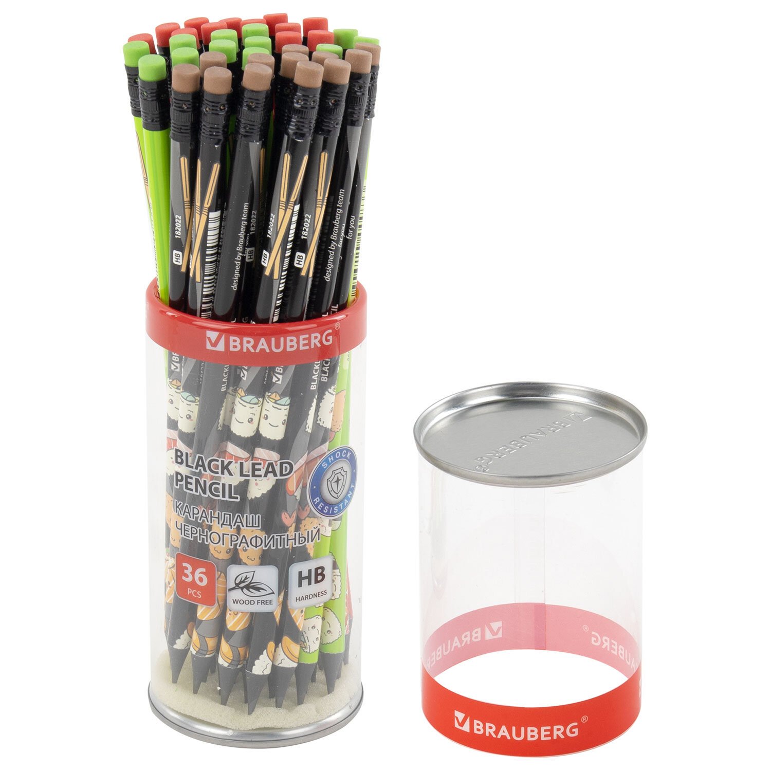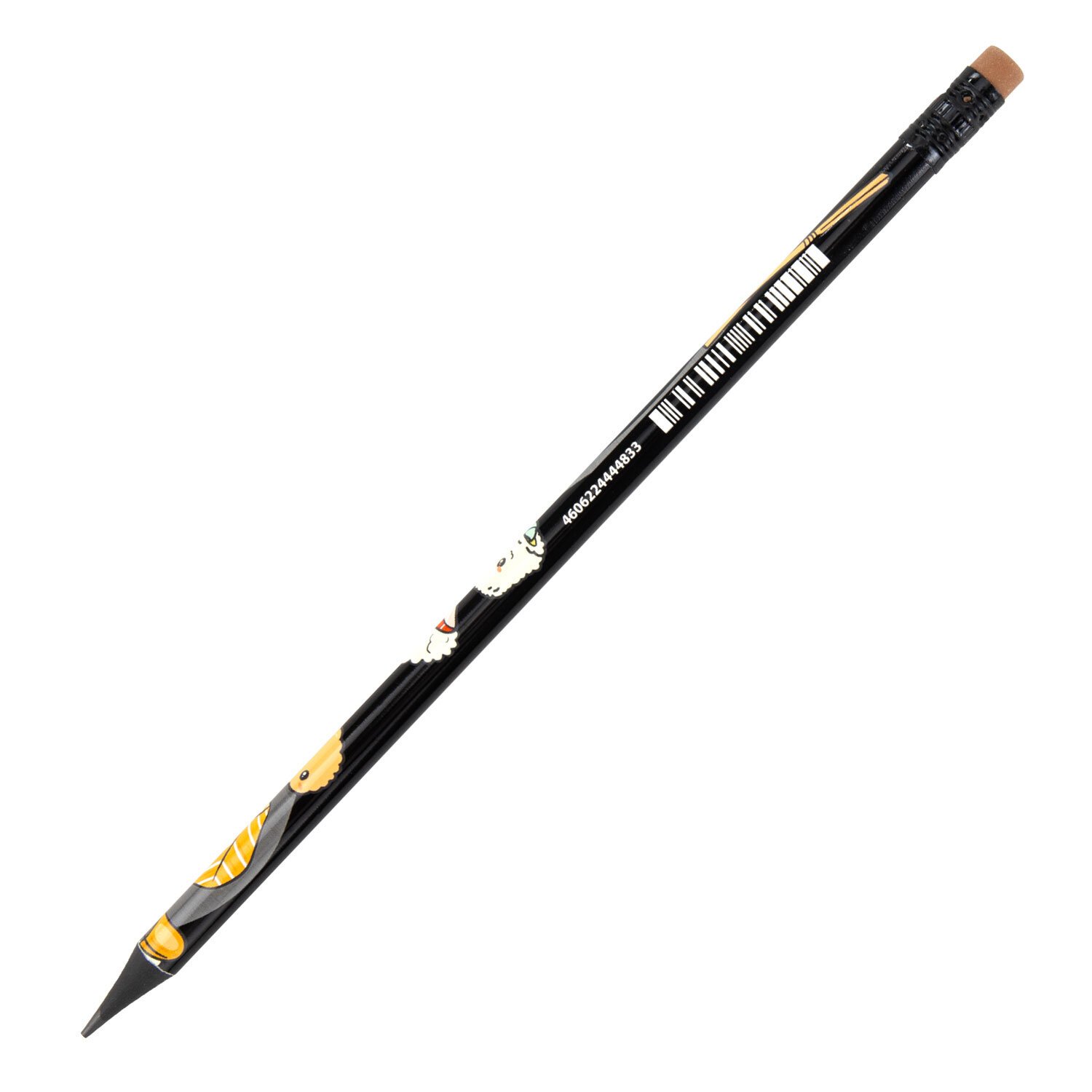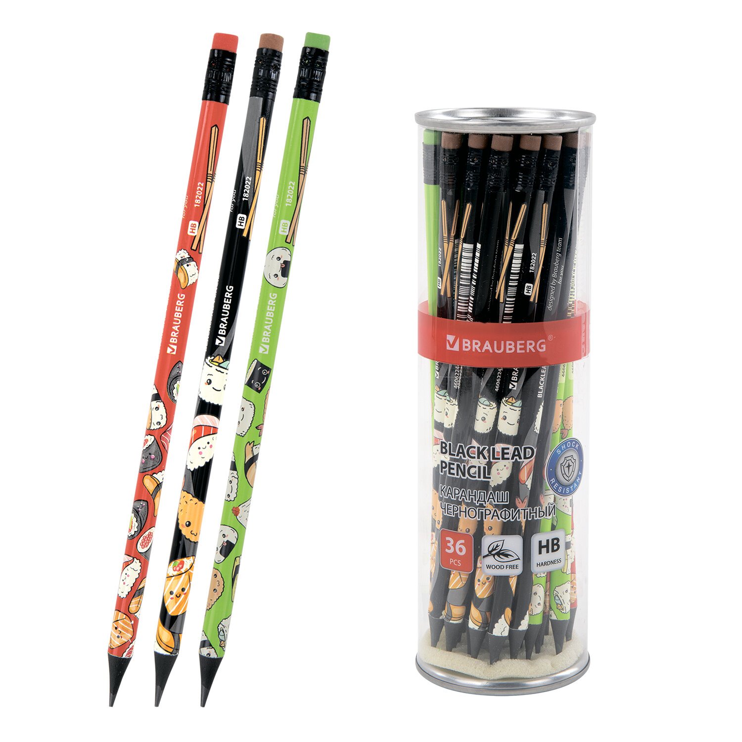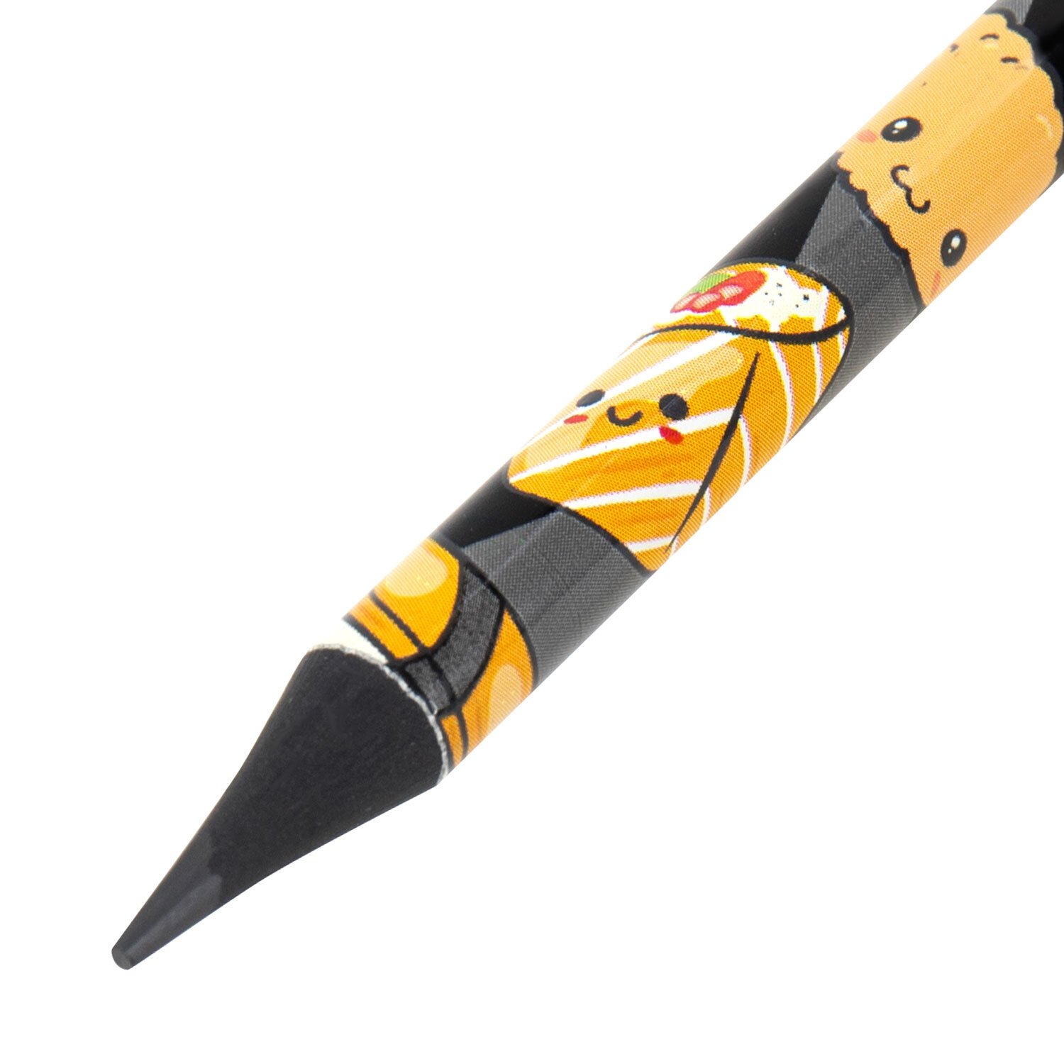 Каждый карандаш имеет индивидуальный штрих-код. Легко затачивается, максимально устойчив к повреждениям. Изготовлен из пластика высокого качества. Имеет круглое сечение и оснащен ластиком. Карандаш длиной 190 мм обладает средней степенью твердости – HB. На корпусе изображены забавные персонажи в виде блюд японской кухни в трех вариантах дизайна (без возможности выбора). Поставляется заточенным в пластиковой тубе по 36 штук.