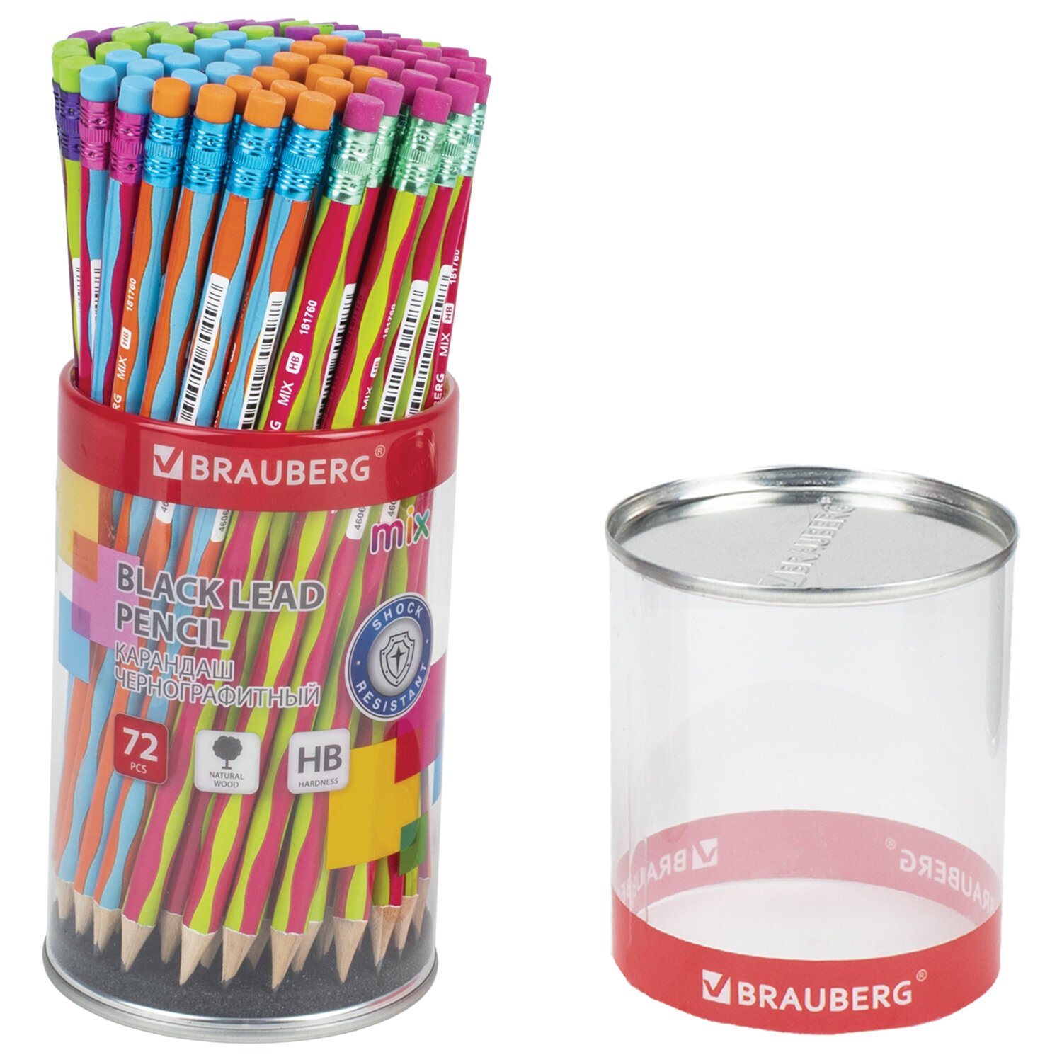 Каждый карандаш имеет индивидуальный штрих-код. Легко затачивается, максимально устойчив к повреждениям. Изготовлен из дерева высокого качества. Имеет круглое сечение и оснащен ластиком. Карандаш длиной 190 мм обладает средней степенью твердости – HB. Корпус покрыт цветной печатью ассорти в 5 дизайнах. Поставляется заточенным в пластиковой тубе по 72 штуки.