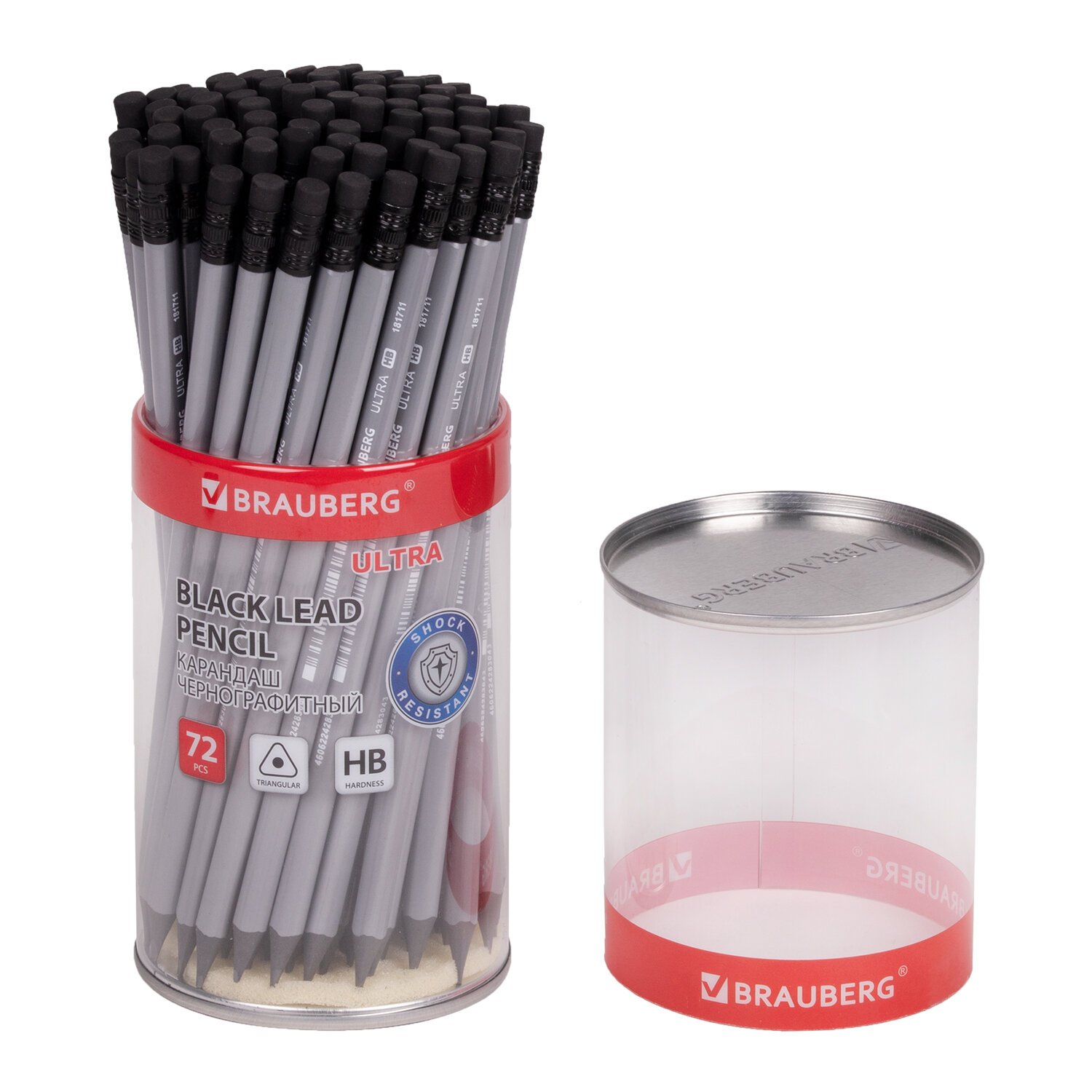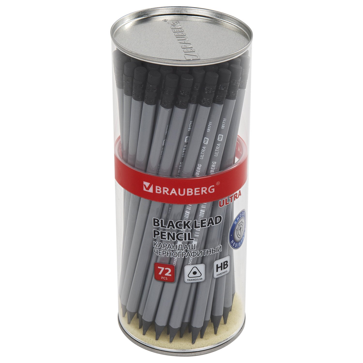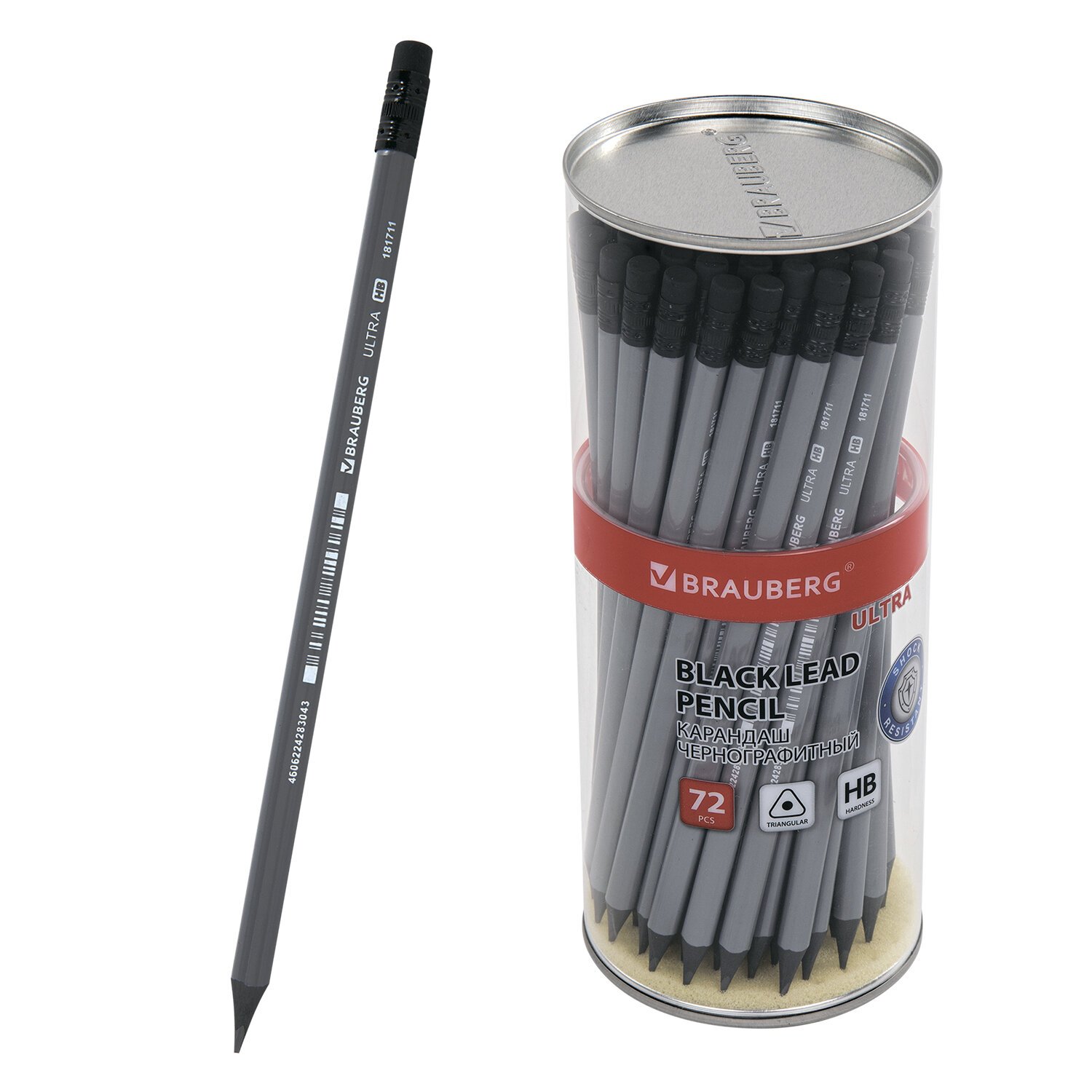 Каждый карандаш имеет индивидуальный штрих-код. Легко затачивается, максимально устойчив к повреждениям. Изготовлен из чёрного пластика высокого качества. Имеет трехгранное сечение и оснащен ластиком. Карандаш длиной 185 мм обладает средней степенью твердости – HB. Цвет корпуса - серый. Поставляется заточенным в пластиковой тубе по 72 штуки.