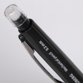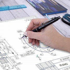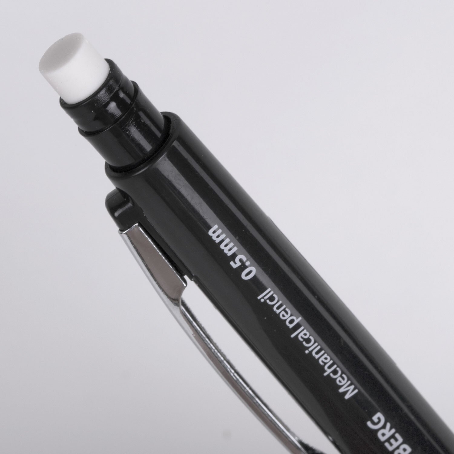 Карандаш с нажимным механизмом заправлен грифелем HB, всегда заточен и готов к работе, дает ровную линию 0,5 мм, а встроенный ластик поможет быстро и легко исправить ошибку. Цанга карандаша убирается внутрь корпуса, поэтому даже на дне сумки или пенала такой карандаш не сломается.