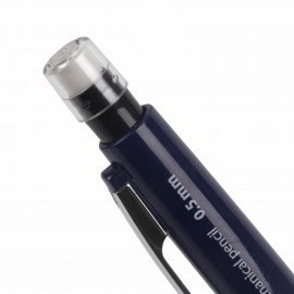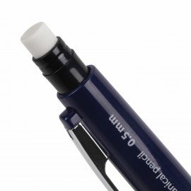 Карандаш с нажимным механизмом заправлен грифелем HB, всегда заточен и готов к работе, дает ровную линию 0,5 мм, а встроенный ластик поможет быстро и легко исправить ошибку. Цанга карандаша убирается внутрь корпуса, поэтому даже на дне сумки или пенала такой карандаш не сломается.