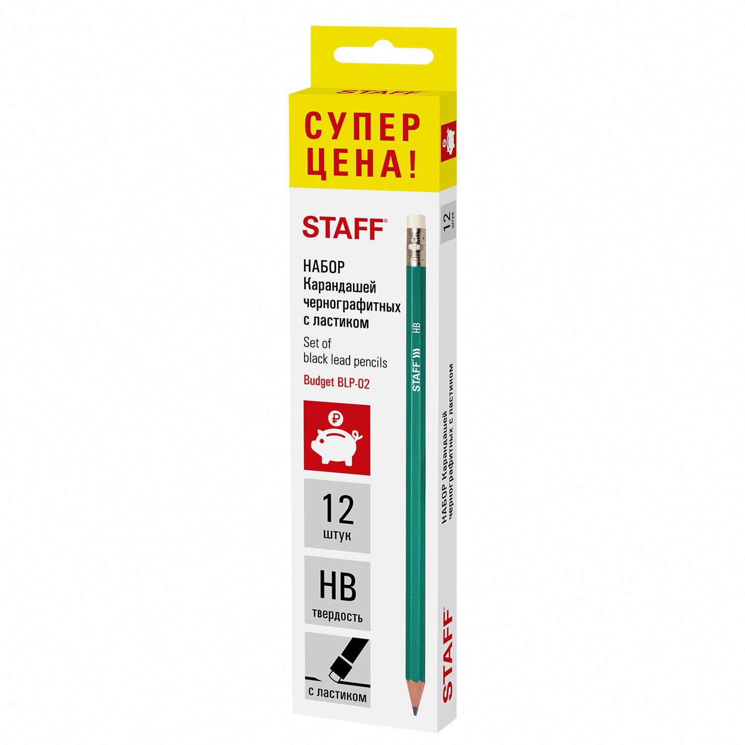 Карандаши чернографитные HB, НАБОР 12 штук STAFF "Budget BLP-02", с ластиком, 181923