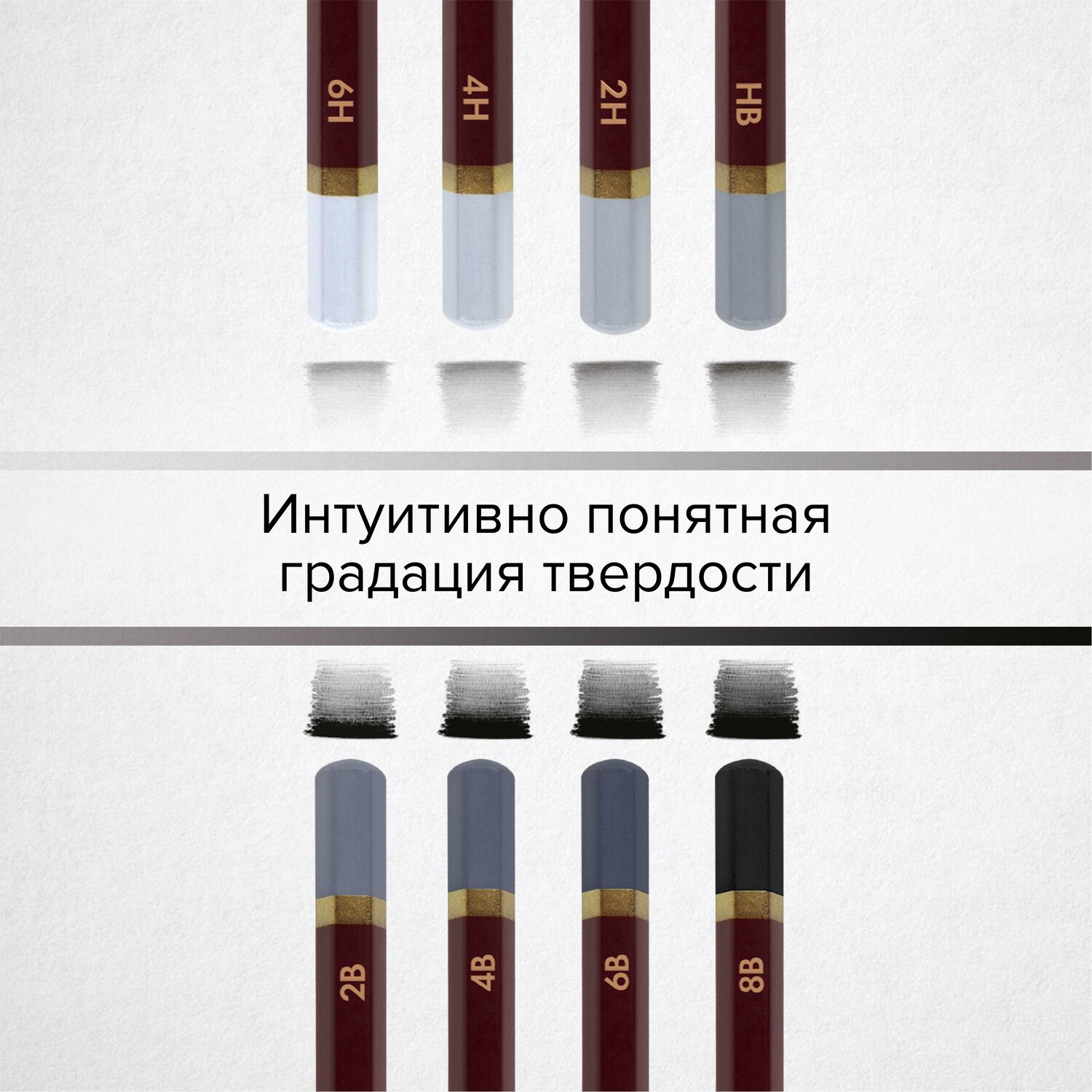 Карандаши легко затачиваются, максимально устойчивы к повреждениям. Изготовлены из дерева высокого качества. Имеют шестигранное сечение. Основной цвет корпуса - бордовый. Цвет кончика карандаша зависит от степени твёрдости - чем мягче, тем темнее. Набор состоит из карандашей различных степеней твердости: 6H - 1 штука (диаметр грифеля 2,0 мм), 4H - 1 штука (диаметр грифеля 2,0 мм), 2H - 1 штука (диаметр грифеля 2,4 мм), HB - 1 штука (диаметр грифеля 2,4 мм), 2B - 1 штука (диаметр грифеля 2,4 мм), 4B - 1 штука (диаметр грифеля 2,4 мм), 6B - 1 штука (диаметр грифеля 3 мм), 8B - 1 штука (диаметр грифеля 3,5 мм). Поставляются заточенными.