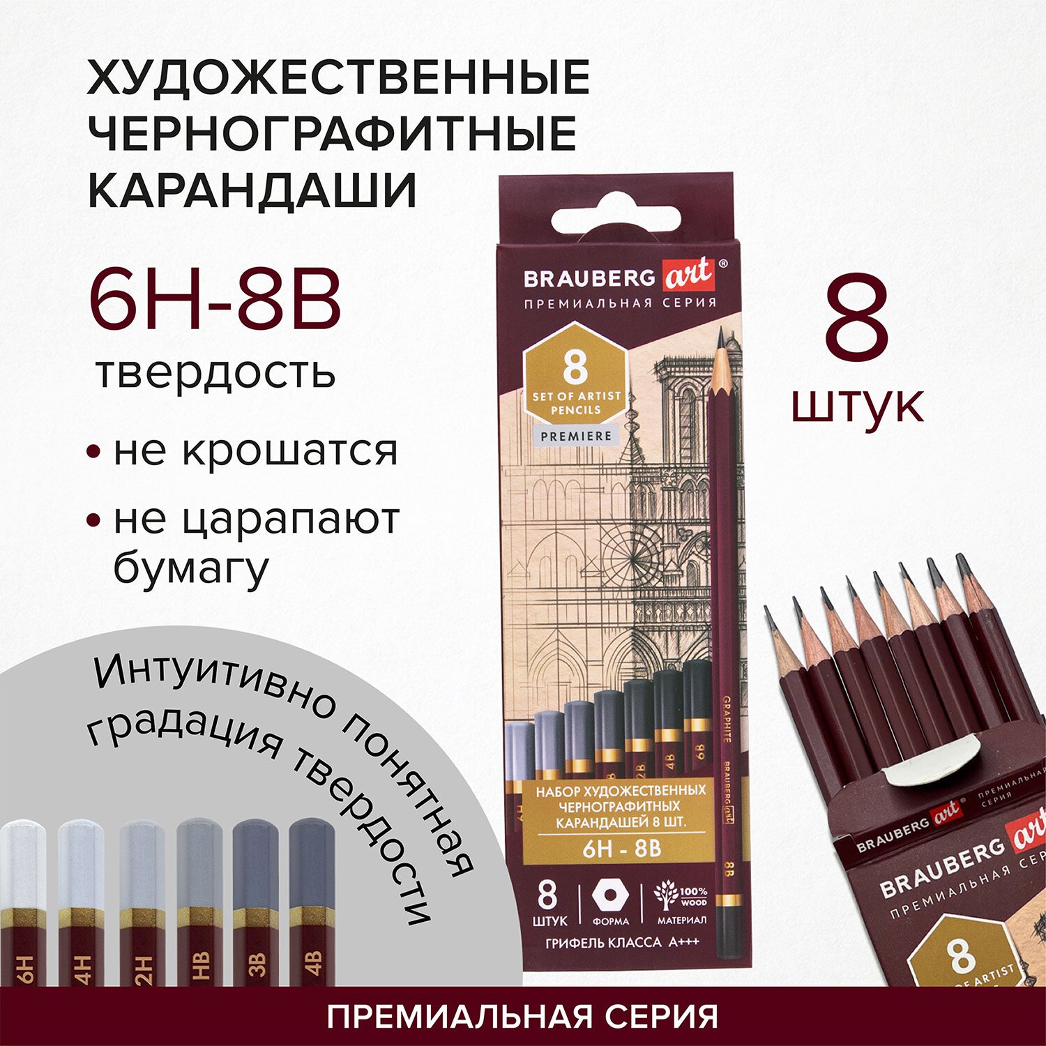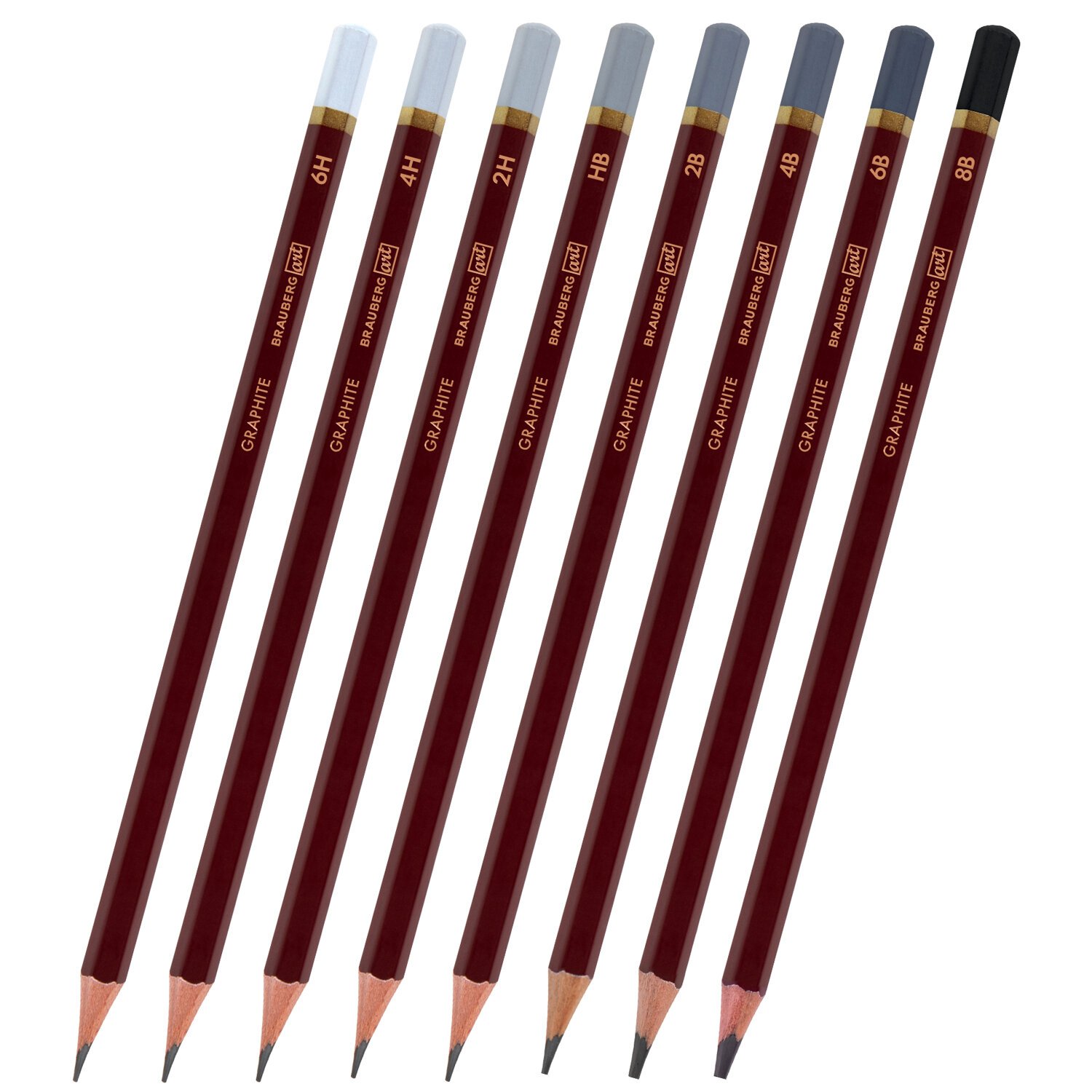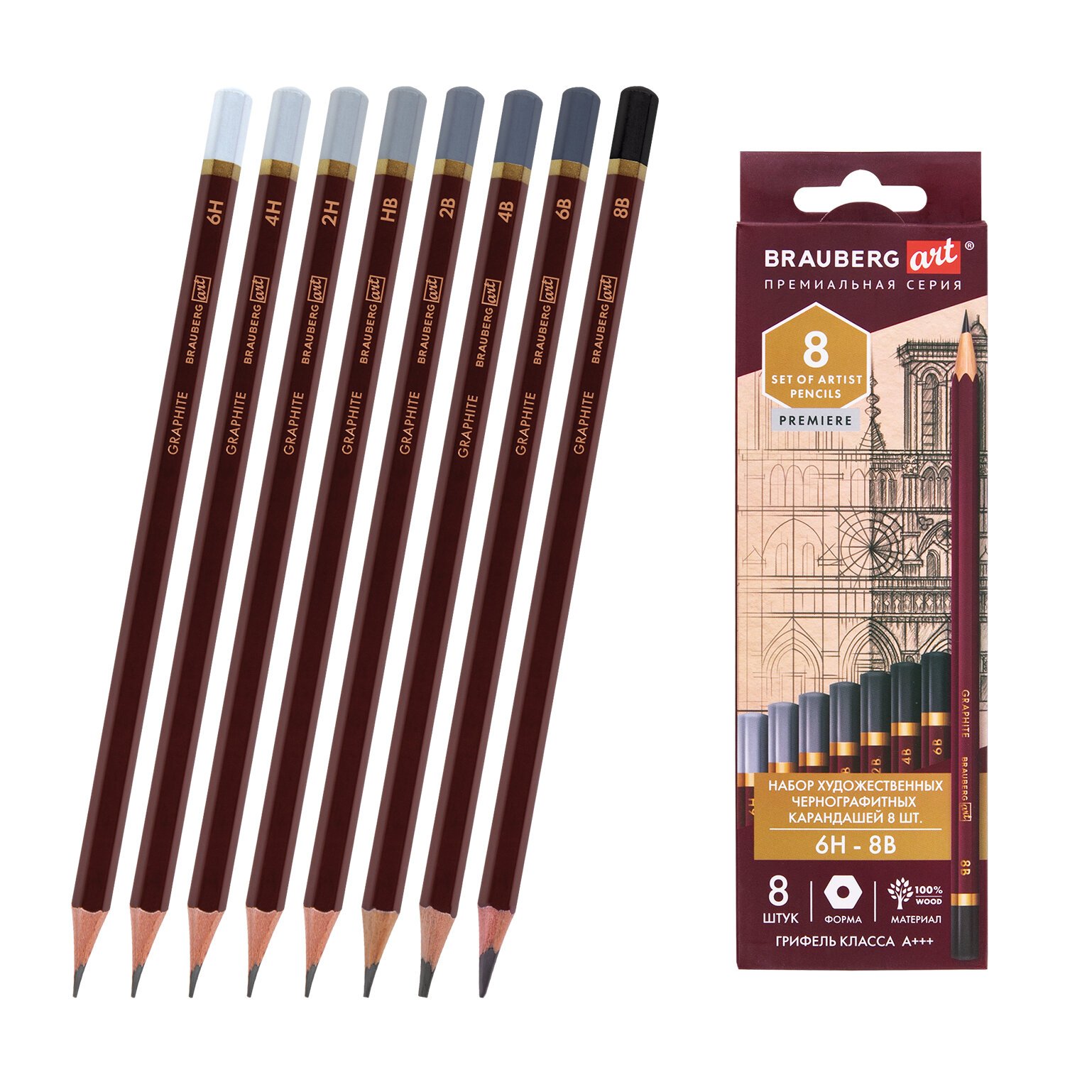 Карандаши чернографитные профессиональные 6H-8B НАБОР 8 штук, BRAUBERG ART "PREMIERE", 181892