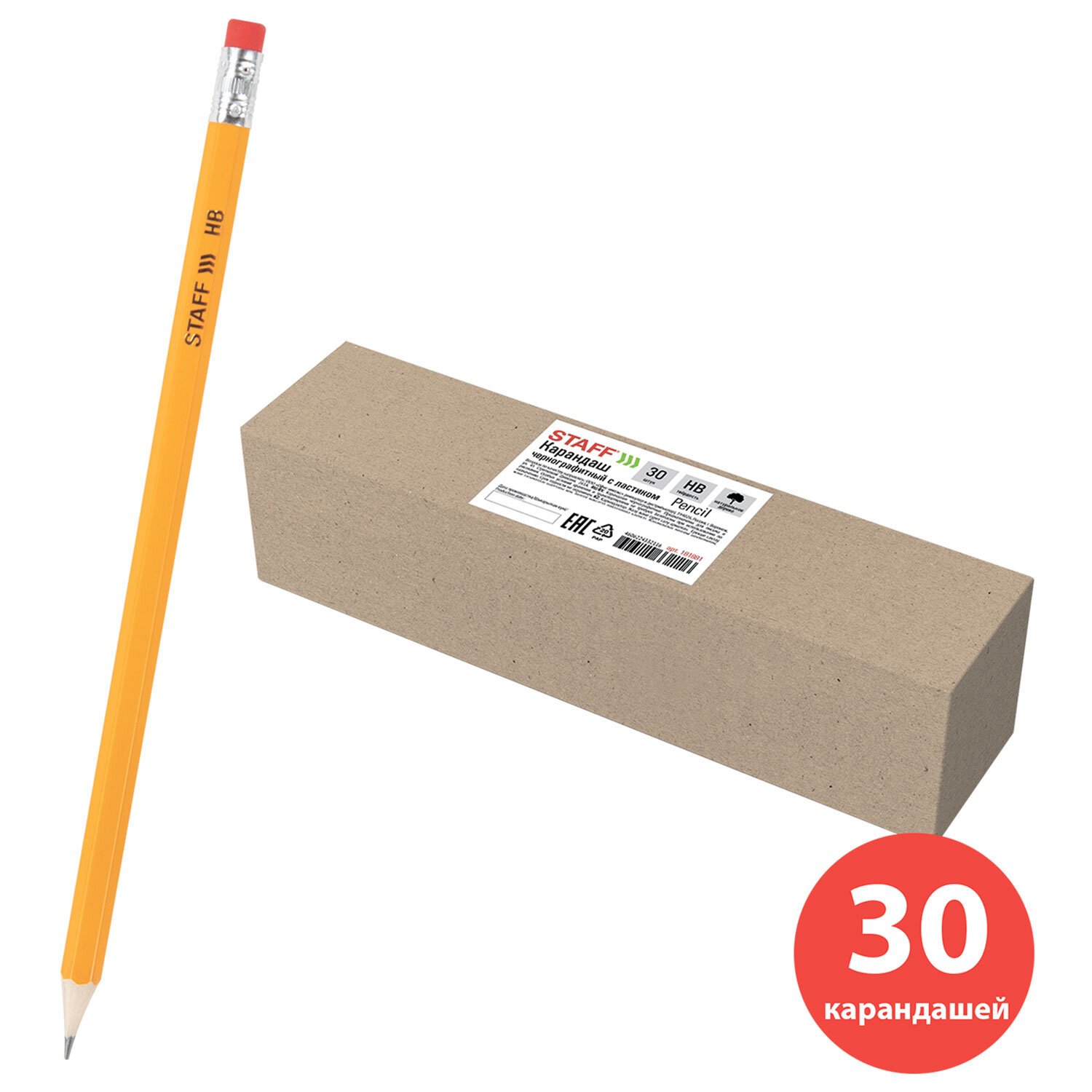 Карандаши чернографитные простые с ластиком HB, ВЫГОДНАЯ УПАКОВКА КОМПЛЕКТ 30 штук, STAFF, 181881