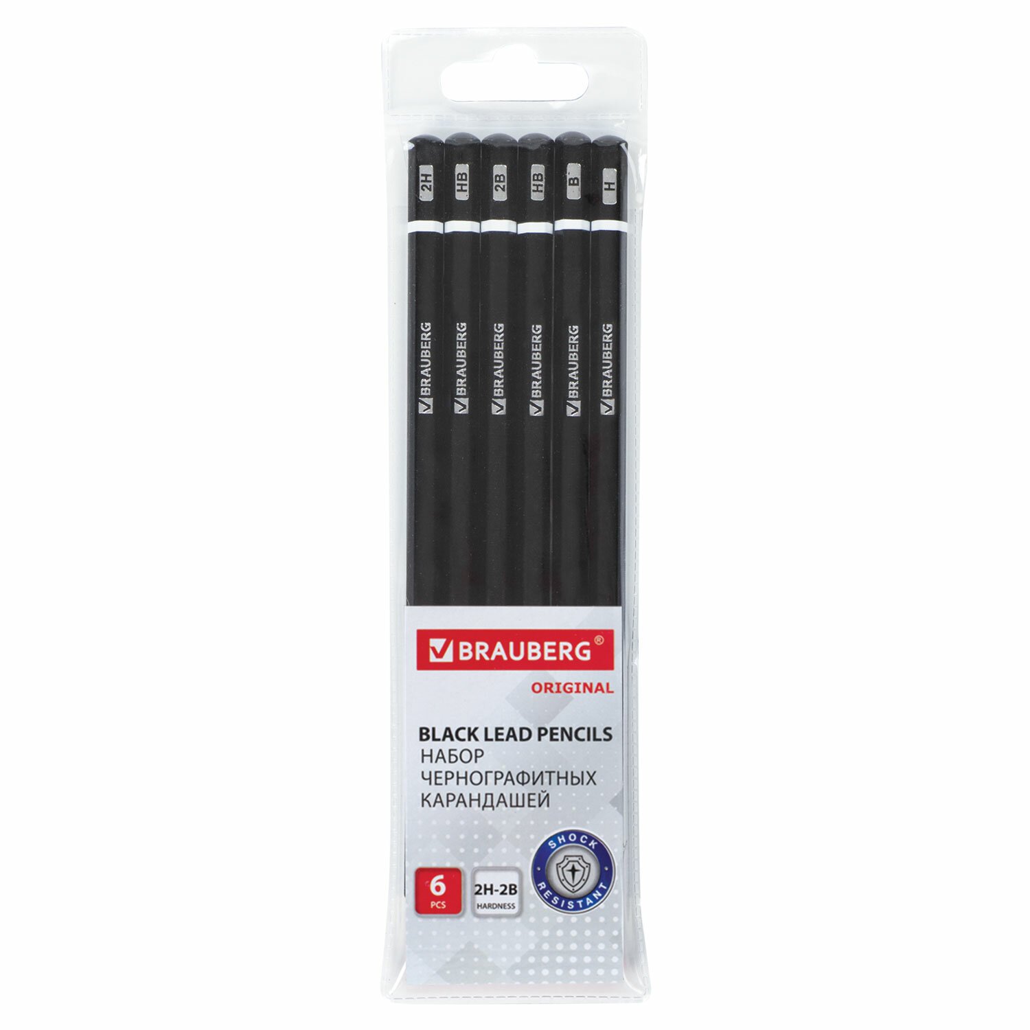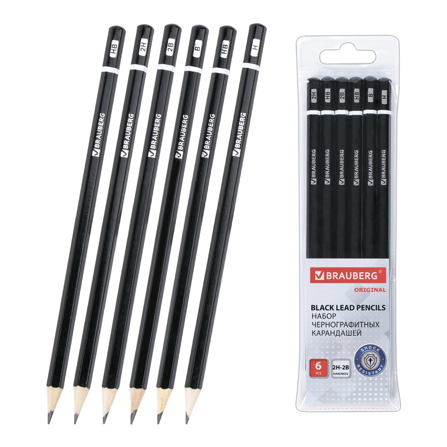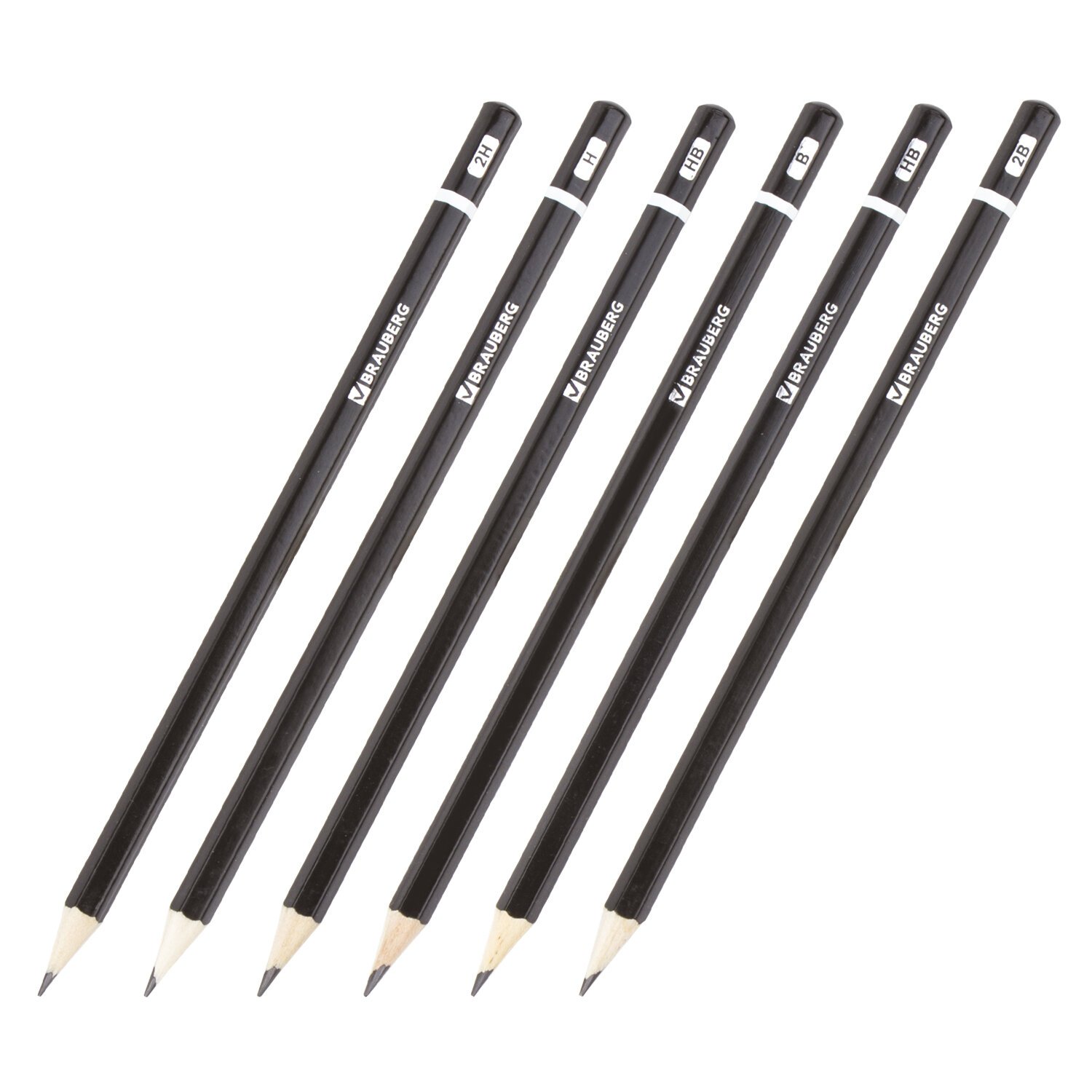 Карандаши чернографитные разной твердости НАБОР 6 штук, 2H-2B, BRAUBERG "Line", 180650
