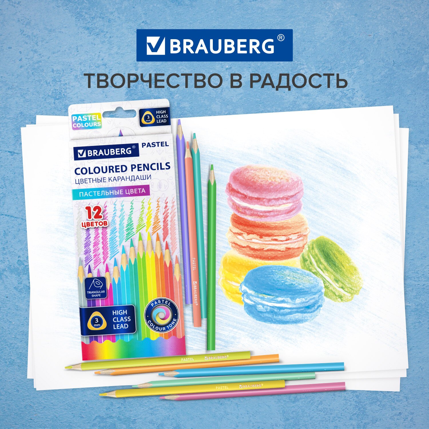 Трехгранные цветные карандаши высокого качества из натурального дерева BRAUBERG серии PASTEL обеспечивают гладкое письмо благодаря мягкому грифелю. Особое качество красящего пигмента гарантирует приятные пастельные цвета.
