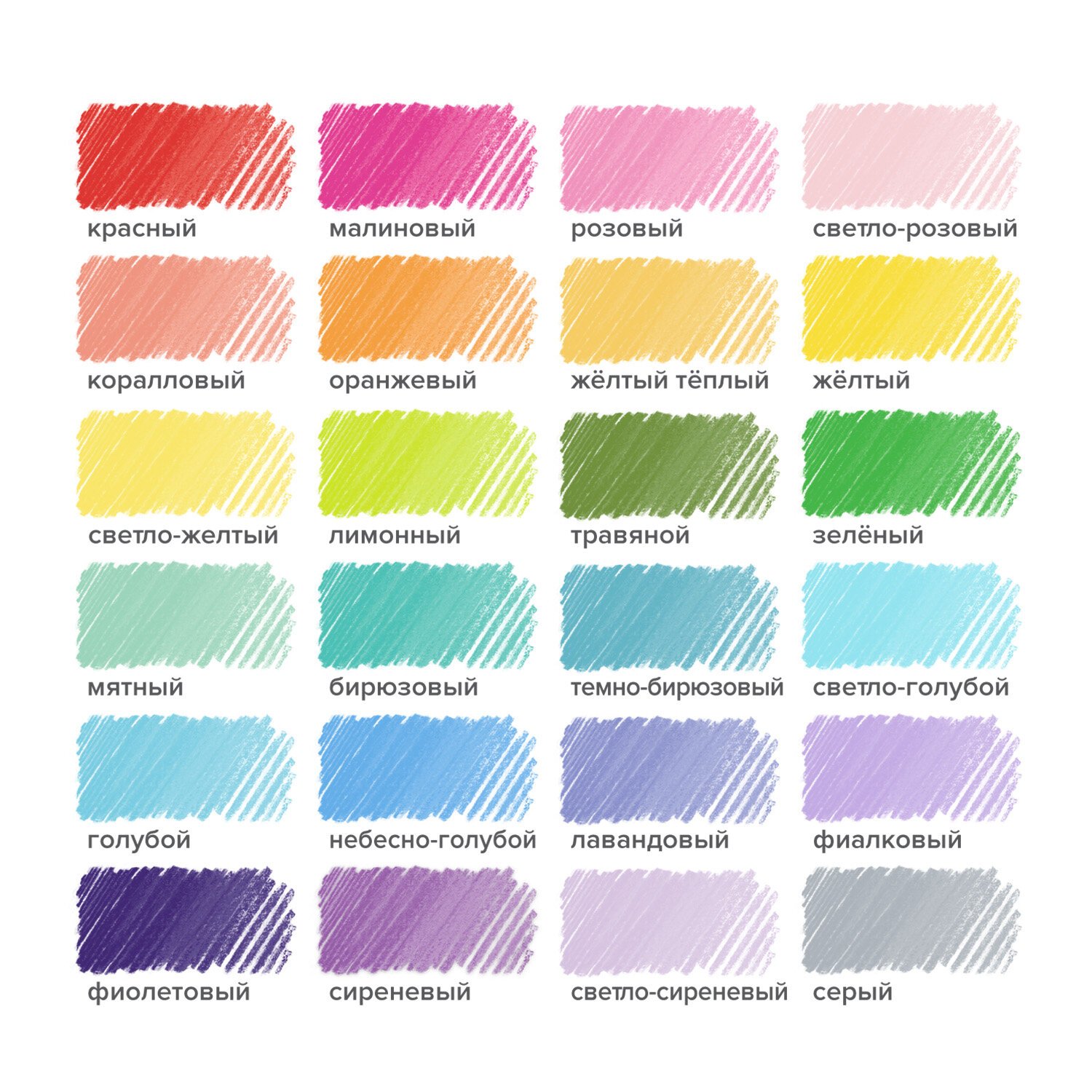 В наборе 24 пастельных цвета: пастельный красный, персиковый, пастельный оранжевый, пастельный жёлтый, пастельный зелёный, мятный, бледно-лазурный, небесно-голубой, пастельный сиреневый, пастельный пурпурный, пастельный фиолетовый, светло-серебристый, бежевый, пастельно-розовый, лавандовый, лавандово-фиолетовый, королевский пурпурный, пастельный голубой, бледно-васильковый, пастельный бирюзовый, оливковый, грушевый, соломенный, бледно-золотой.