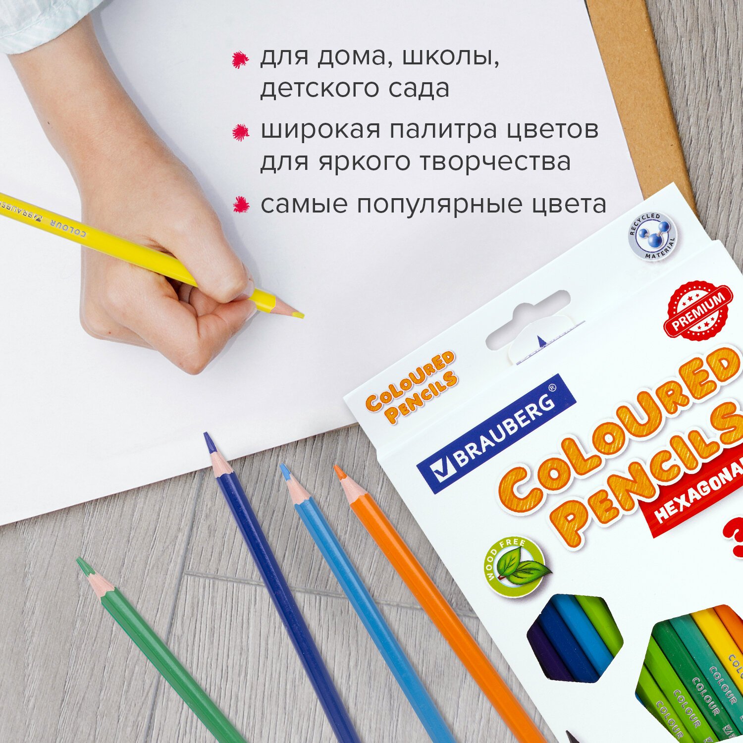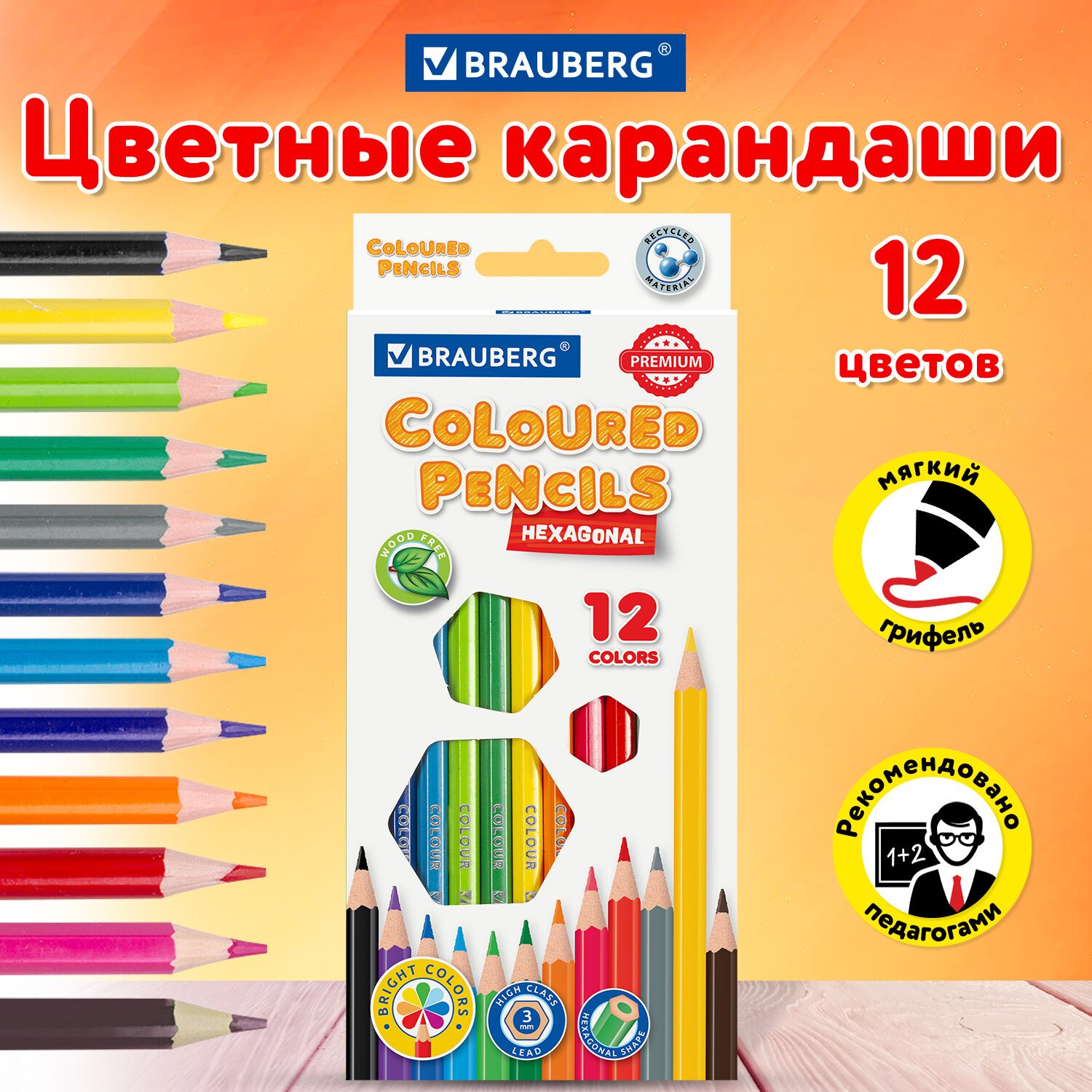 Карандаши цветные BRAUBERG PREMIUM, 12 цветов, шестигранные, грифель 3 мм, 181666