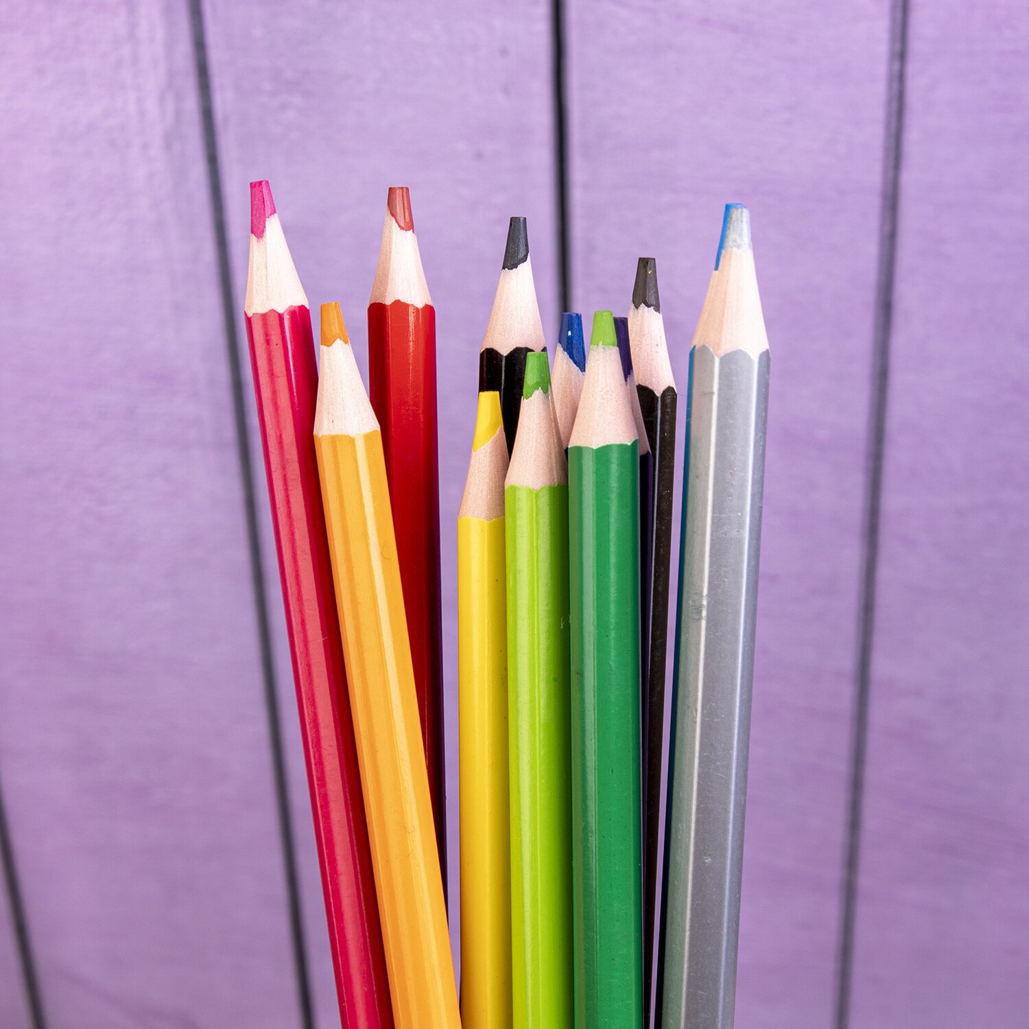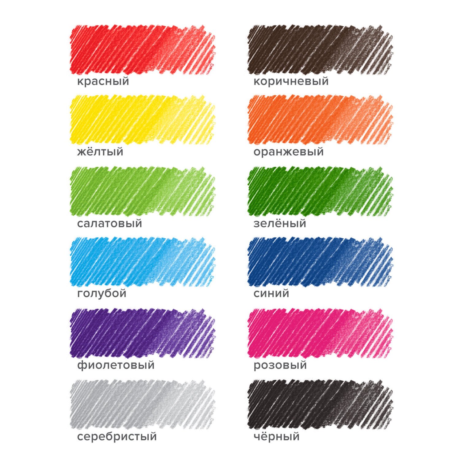Набор состоит из 12 цветов: черный, синий, голубой, салатовый, зеленый, желтый, оранжевый, розовый, красный, серый, фиолетовый, коричневый. Шестигранная форма сечения корпуса позволяет не скатываться карандашу с поверхности стола во время занятий рисованием. Карандаши изготовлены из высококачественного материала и имеют лакированный корпус. Качество исполнения гарантирует легкую заточку. Грифель диаметром 3 мм обладает повышенной прочностью. Все карандаши заточены и поставляются в картонной упаковке с европодвесом.