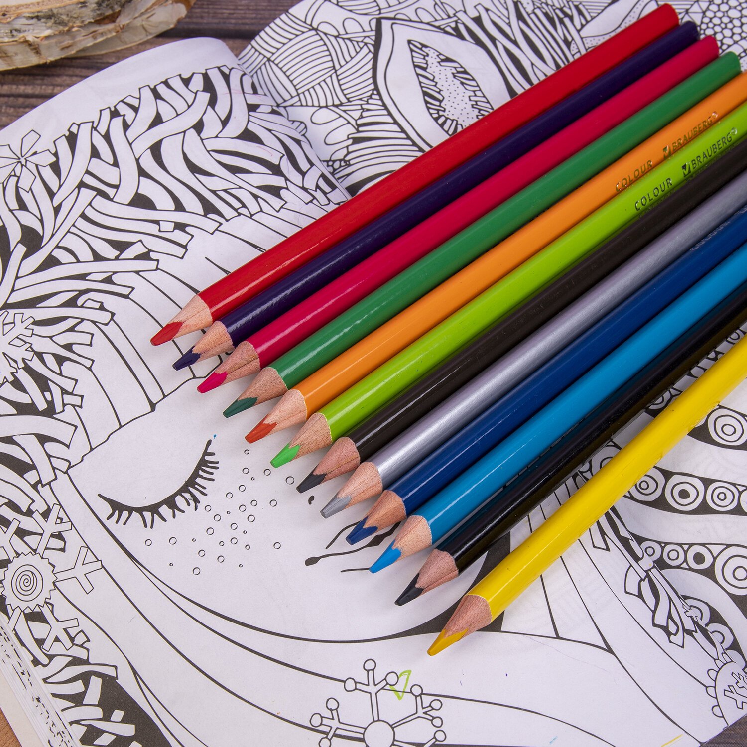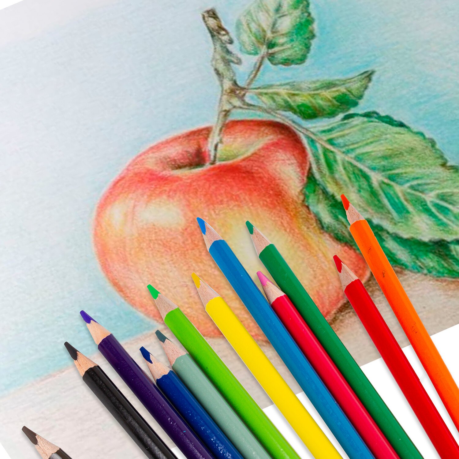 Набор состоит из 12 цветов: черный, синий, голубой, салатовый, зеленый, желтый, оранжевый, розовый, красный, серый, фиолетовый, коричневый. Трехгранная форма сечения корпуса позволяет не скатываться карандашу с поверхности стола во время занятий рисованием. Они изготовлены из древесины ценных пород и имеют лакированный корпус. Высокосортная древесина и качество исполнения гарантируют легкую заточку. Грифель диаметром 3,3 мм обладает повышенной прочностью. Все карандаши заточены и поставляются в картонной упаковке с европодвесом.