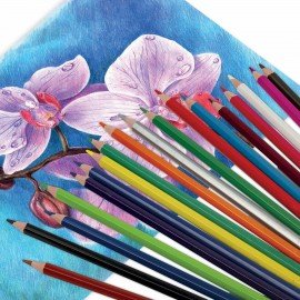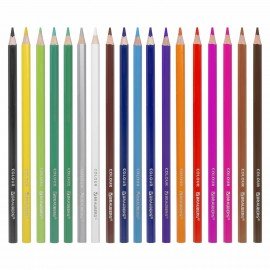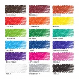 Набор состоит из 18 цветов: черный, темно-синий, синий, голубой, салатовый, зеленый, темно-зеленый, желтый, оранжевый, фуксия, розовый, красный, бордовый, серый, светло-серый, фиолетовый, темно-коричневый, коричневый. Шестигранная форма сечения корпуса позволяет не скатываться карандашу с поверхности стола во время занятий рисованием. Карандаши изготовлены из высококачественного материала и имеют лакированный корпус. Качество исполнения гарантирует легкую заточку. Грифель диаметром 3 мм обладает повышенной прочностью. Все карандаши заточены и поставляются в картонной упаковке с европодвесом.