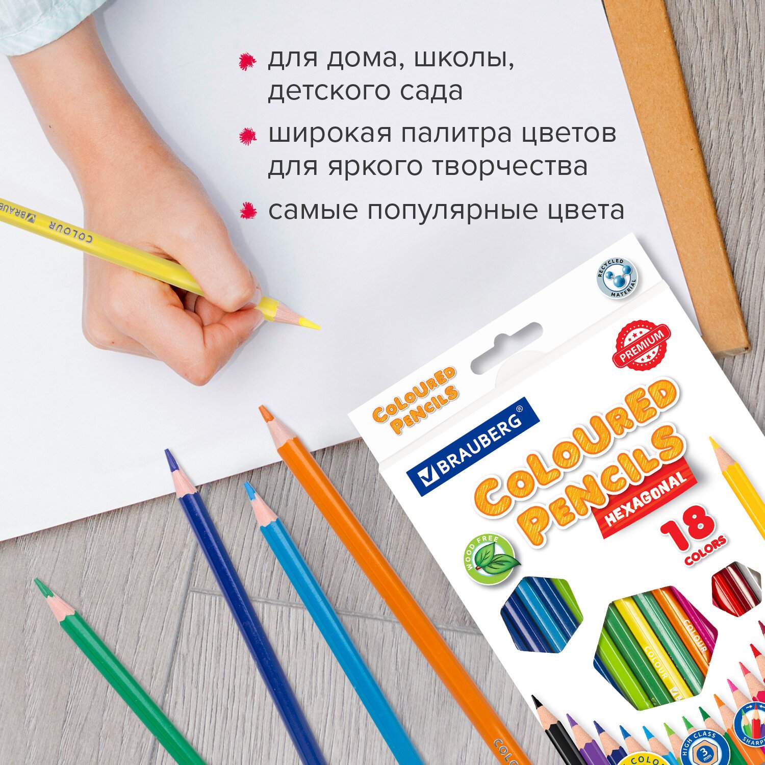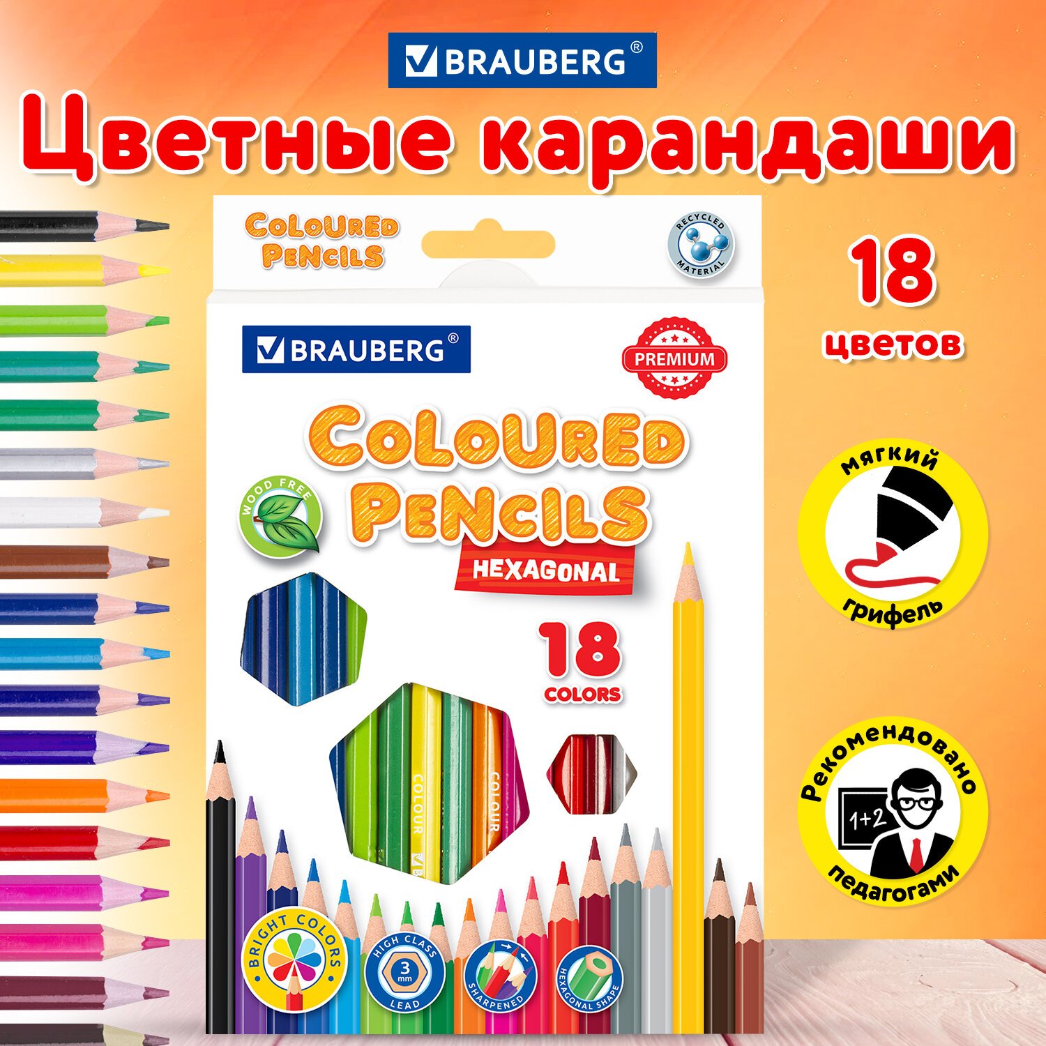 Карандаши цветные BRAUBERG PREMIUM, 18 цветов, шестигранные, грифель 3 мм, 181667