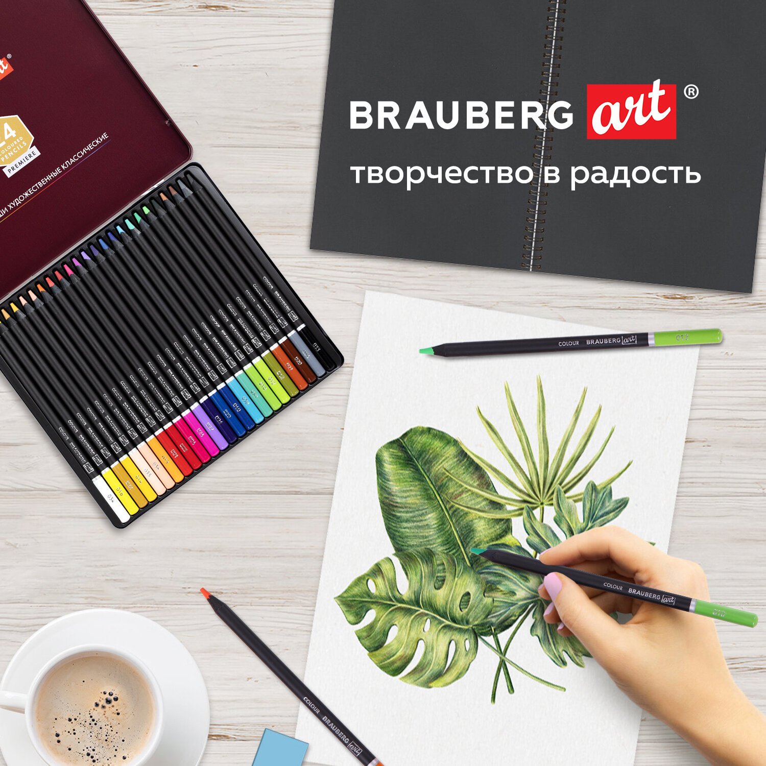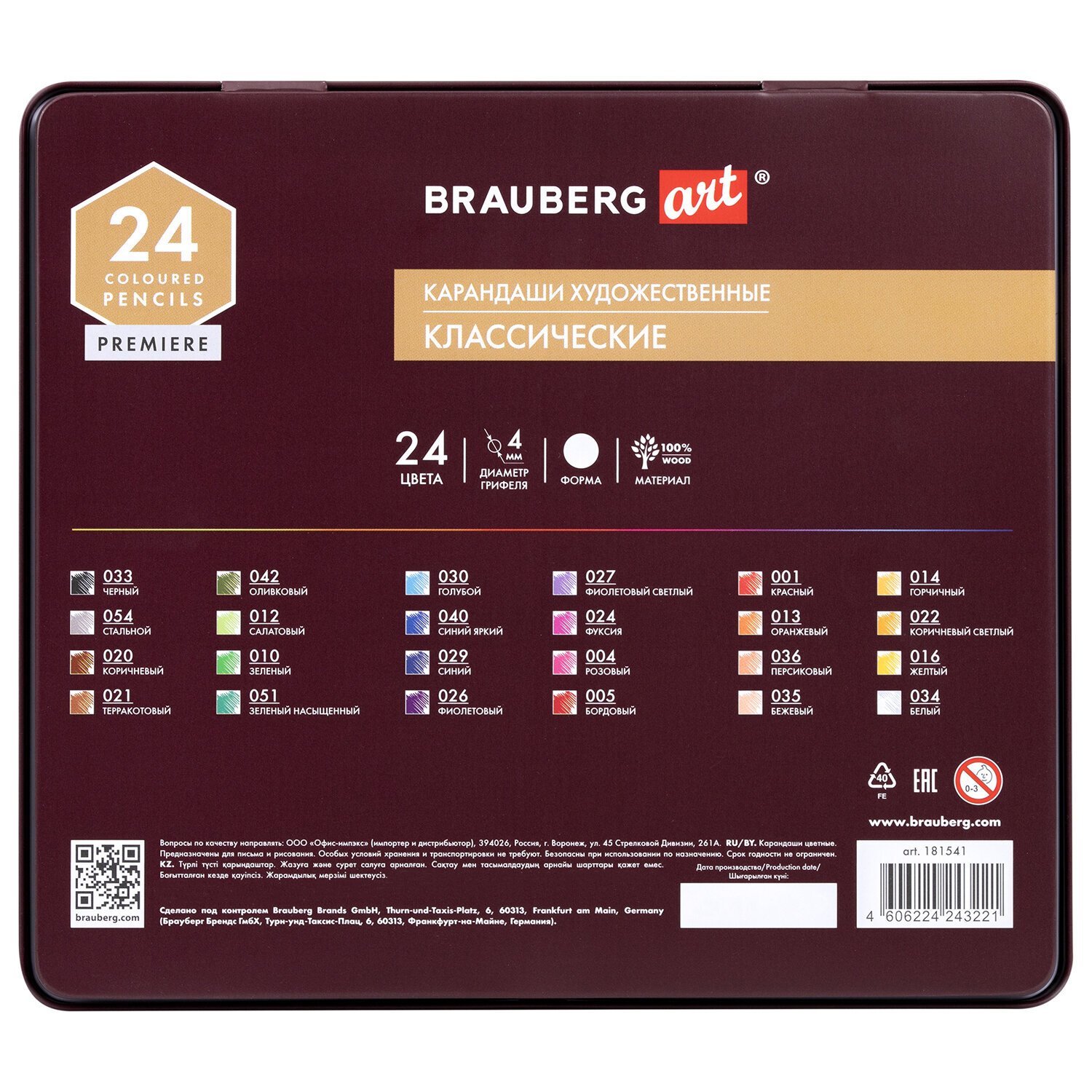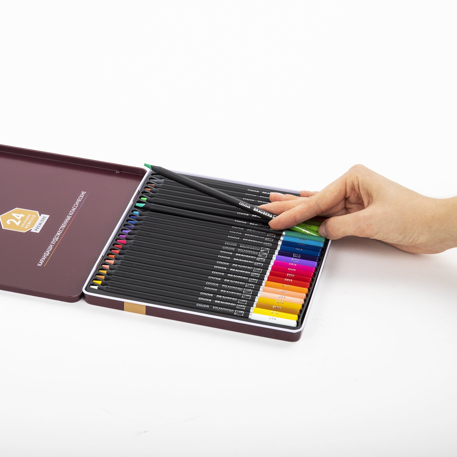 Карандаши цветные художественные BRAUBERG ART PREMIERE, 24 цвета, МЯГКИЙ грифель 4 мм, металл, 181541
